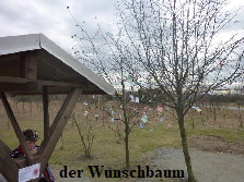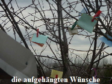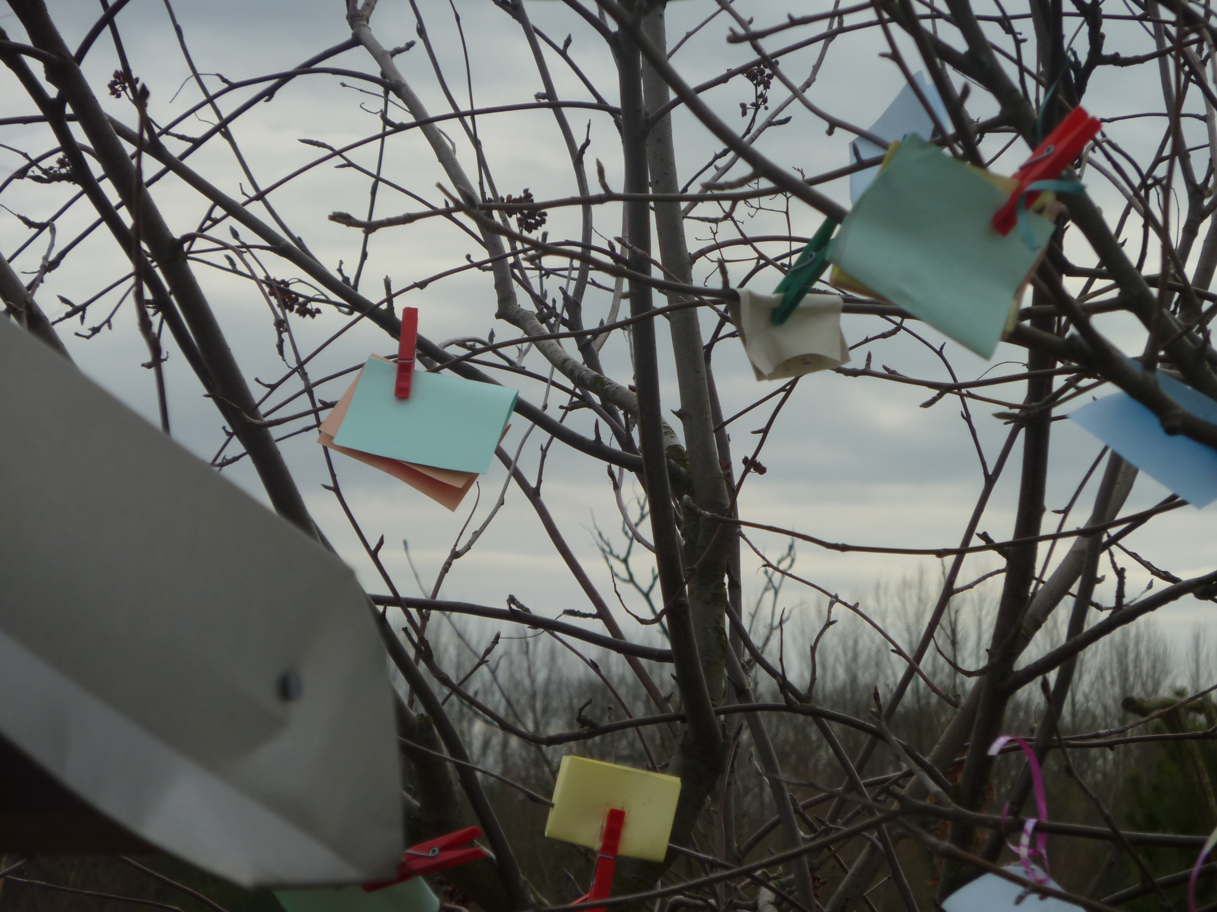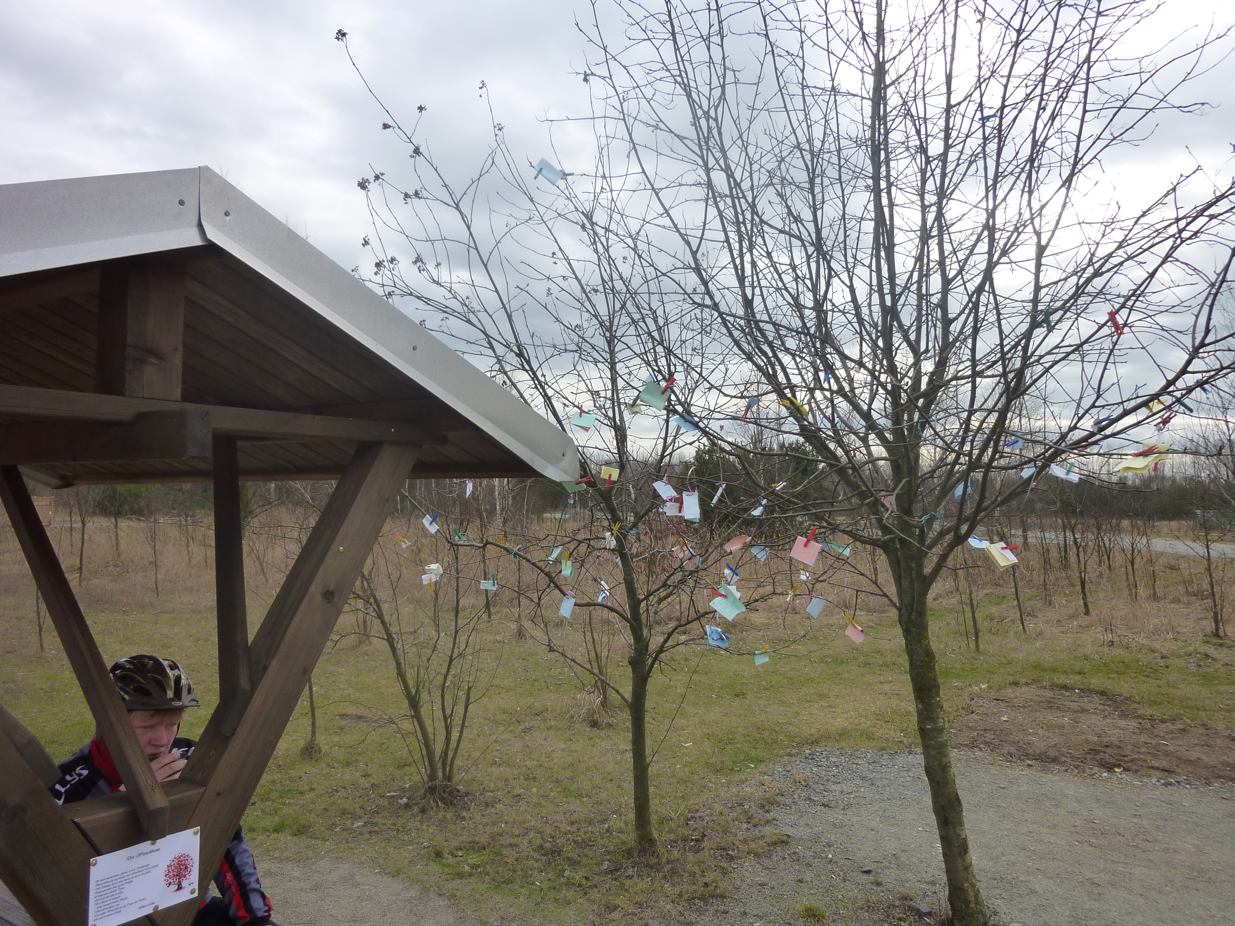 Pausenstelle lagen ein Kästchen mit Zetteln und Stiften. Wir schrieben jeder einen Wunsch auf einen Zettel und klemmten diese, mit Hilfe von Klammern, an den Baum. Dann fuhren wir zurück
