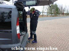 Am Parkplatz zogen wir uns ordentlich warm an. Ines hatte ihren Ohrenschutz mit, welcher bei dem Wind ganz wichtig ist. Zu Hause hatten wir uns vorsichtshalber schon die lange