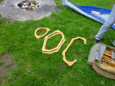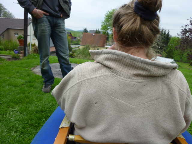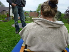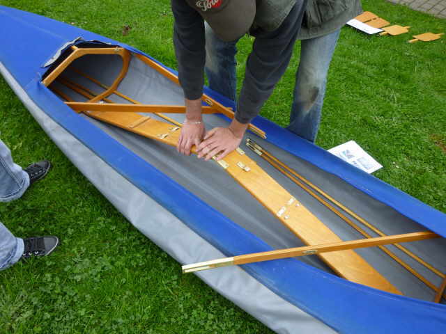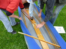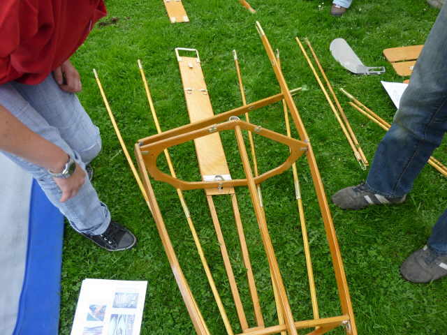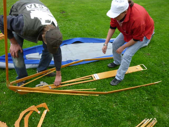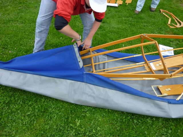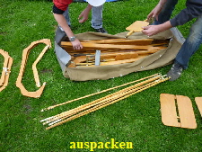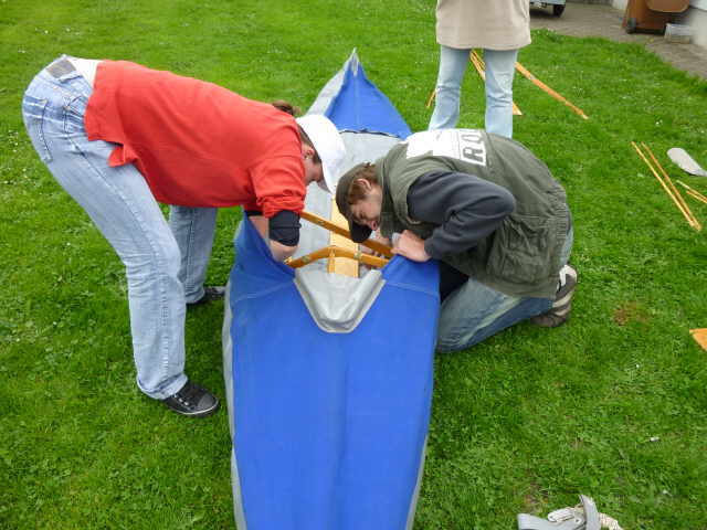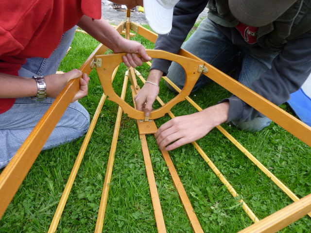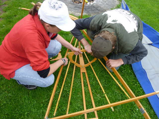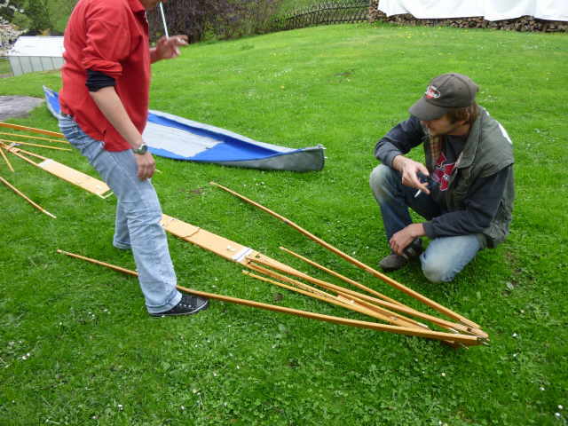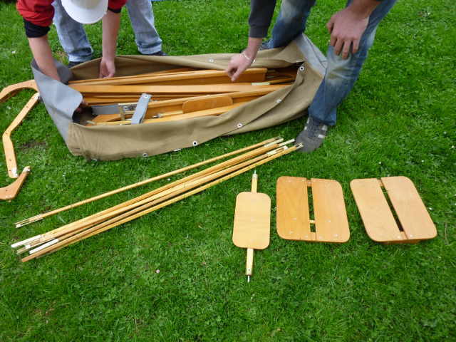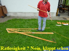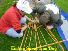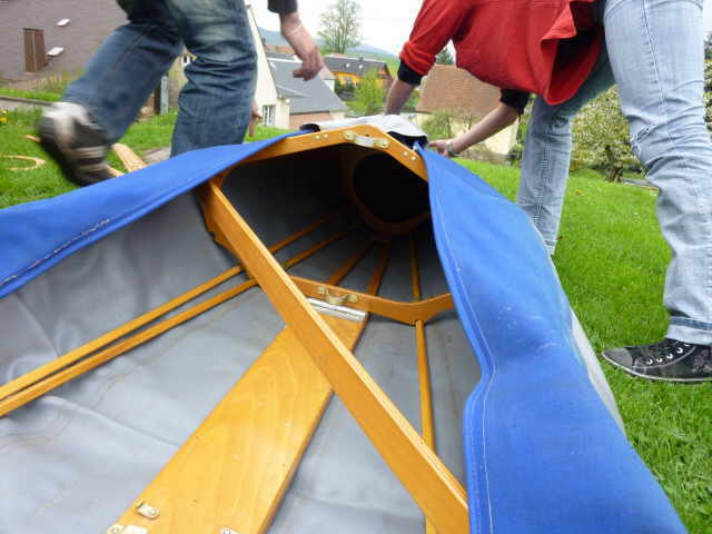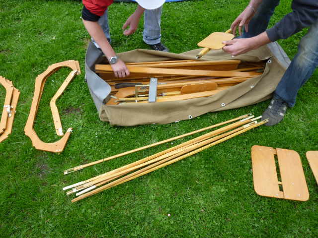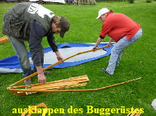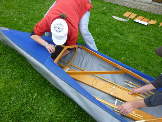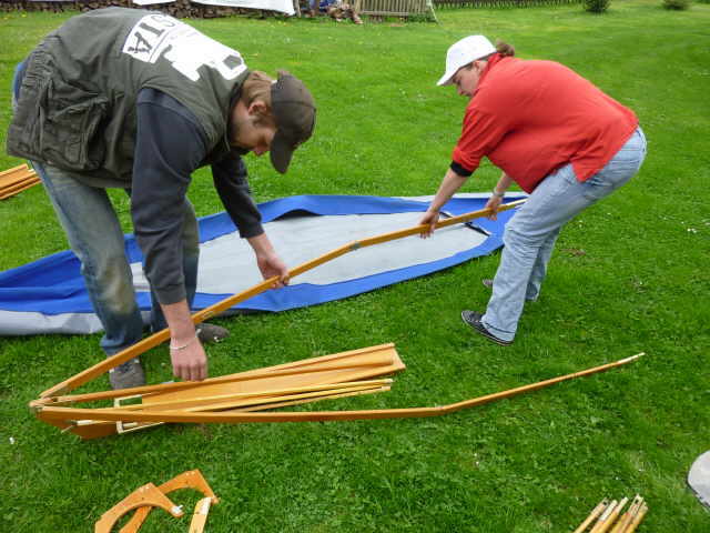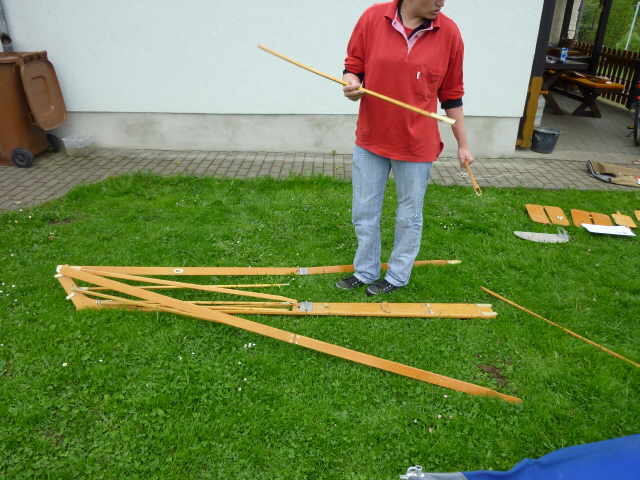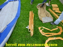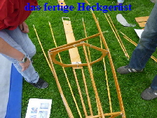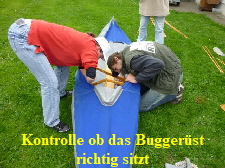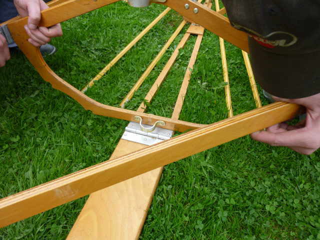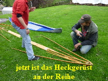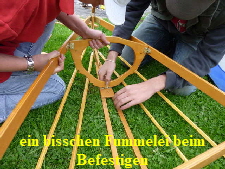 Nachdem das Gerüst eingesetzt, die Boden- und Seitenleitern gespannt und die Stangen verbunden sind, werden der Süllrand und die Sitze montiert. Dabei ist zu beachten, dass die Sitze mit