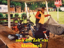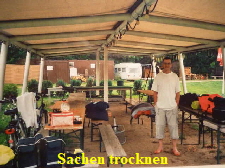 konnten wir, nach dem Abbau, erst mal die Klamotten unterstellen. Wir warteten eine ganze Weile, ob der Regen nicht doch noch aufhört. Leider wurde unser Wunsch nicht erfüllt. Das