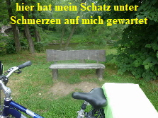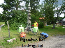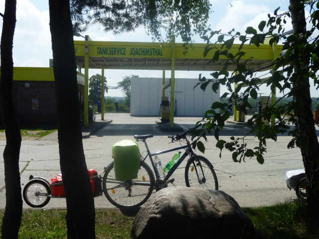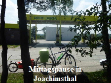 als es die Steigungen sind. An der Einfahrt Biesenthal war es dann ganz schlimm, so dass wir absteigen und schieben mußten. An der Straße war gleich ein Bäcker. Wir tranken einen guten