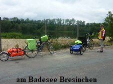 Die Fahrt geht durch Groß Breesen und denn rechts zum Badesee. Die nächste Pause machten wir am Badesee Bresinchen, an dem wir schon einige Mal gezeltet haben. Nur kurz einen Riegel
