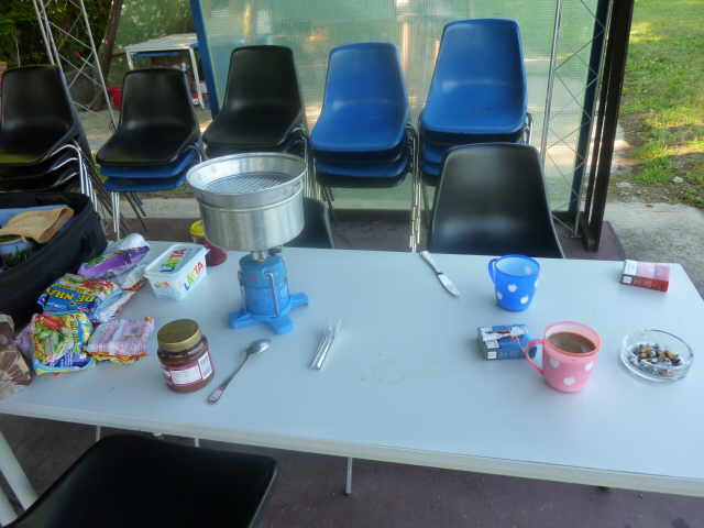 Aufstehen um sechs. Wir gehen uns gleich waschen und beginnen mit dem Abbau. Am Abend zuvor haben wir uns Brötchen und Kaffee bestellt. Gegen 07:15 Uhr können wir dann