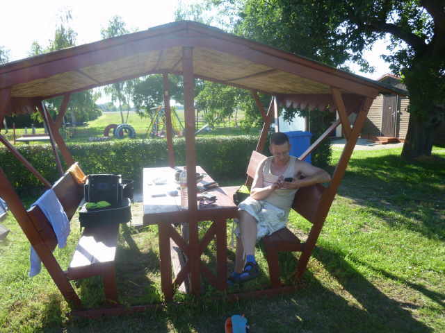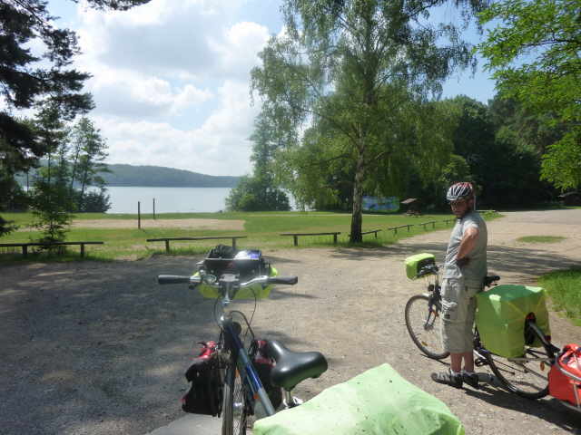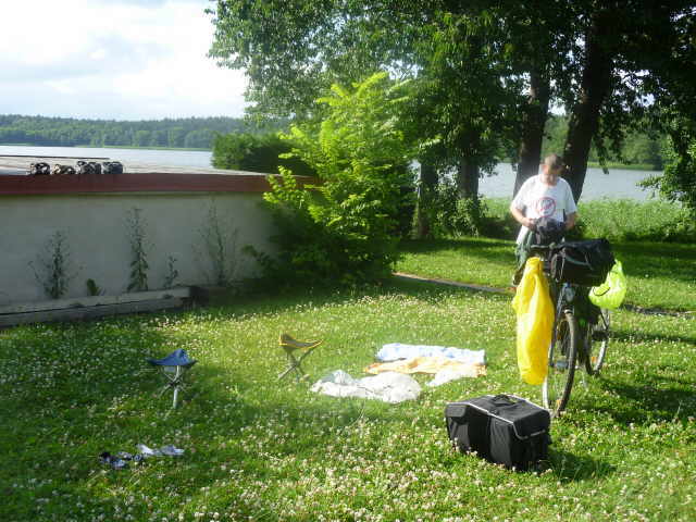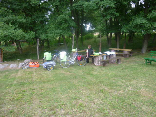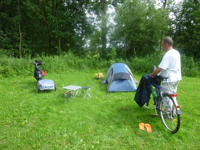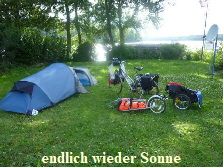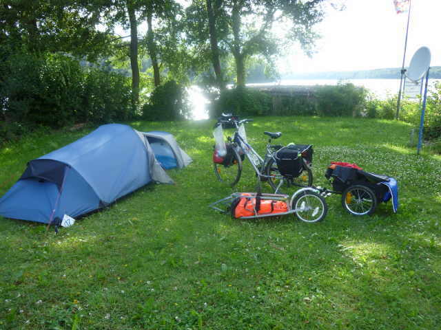 Kindern und ein einzelner Radler auf dem Platz. Wir gingen nach dem Aufbau mal ans Ufer zur Badestelle, dann waschen und zu Abend essen. Wir sitzen noch bei uns vor dem Zelt, spielen