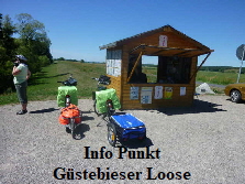 Kiosk als Info-Punkt für die Region der Güstebieser Loose. Wir hielten an und fragten, ob es in der Nähe ein Möglichkeit zum Zelten gibt. Und, wie der Zufall so will, lagen dort Flyer