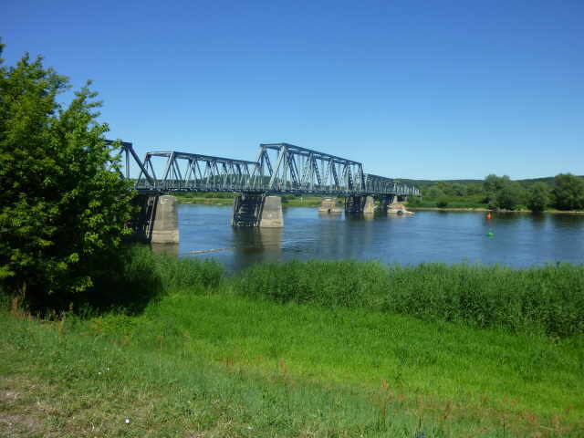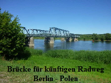 noch komplette Brücke über die Oder. An der Infotafel konnte man lesen, dass hier künftig ein Radweg Richtung Polen führen soll. Dieser Radweg wird auf dem alten Bahndamm der Strecke von