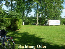 verlassen wir den Radweg und fahren 7,5 km, über Manschnow, nach Gorgast. Den Zeltplatz fanden wir nach dreimaliger Passantenbefragung. Wir meldeten uns beim Betreiber, bauten unser Zelt