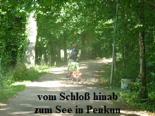 Penkun in Sicht. Wir durchquerten den Schloßhof und der Radweg führte runter zum Schloßsee. Da steht oben noch ein Schild: “Radfahrer absteigen!” Mit Gepäck und Anhänger