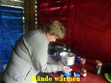 und auch die Küche gezeigt. Wir bauten das Zelt auf. Zum Glück hatte es aufgehört zu regnen.