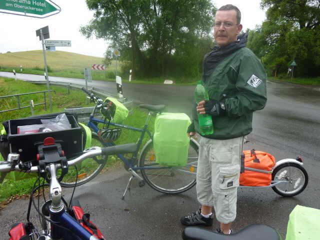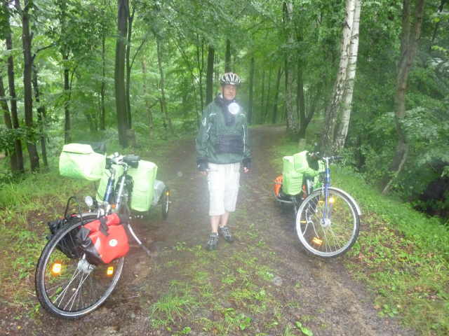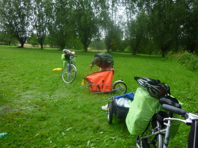 Regen, die ersten 15 km des Tages. Am Zeltplatz Warnitz tranken wir einen Kaffee und essen ein paar Riegel. Nun fing es wieder an wie verrückt zu schütten.