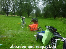 Der Tag beginnt um 06:00 Uhr. Das Wetter ist warm aber stark bewölkt. Nach der Morgentoilette beginnen wir mit dem Abbau. Ines im Zelt und ich belade die Räder. Plötzlich