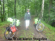 Stegelitz kamen wir auf eine ganz schlimme Wegstrecke. Eine Pflasterstraße durch den Wald. Am Rand nur Schlamm. Das Pflaster durch die Nässe absolut glitschig und dazu ging es noch gut