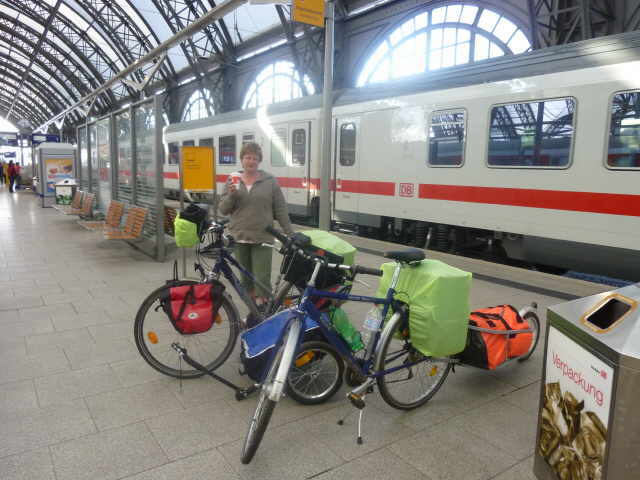 Wir konnten bis zur Abfahrt noch in Ruhe unseren Kaffee genießen. Dann fuhr der Zug ein. Nach der Erfahrung in Elsterwerda (sich schließende Tür), stellten wir die Räder