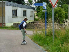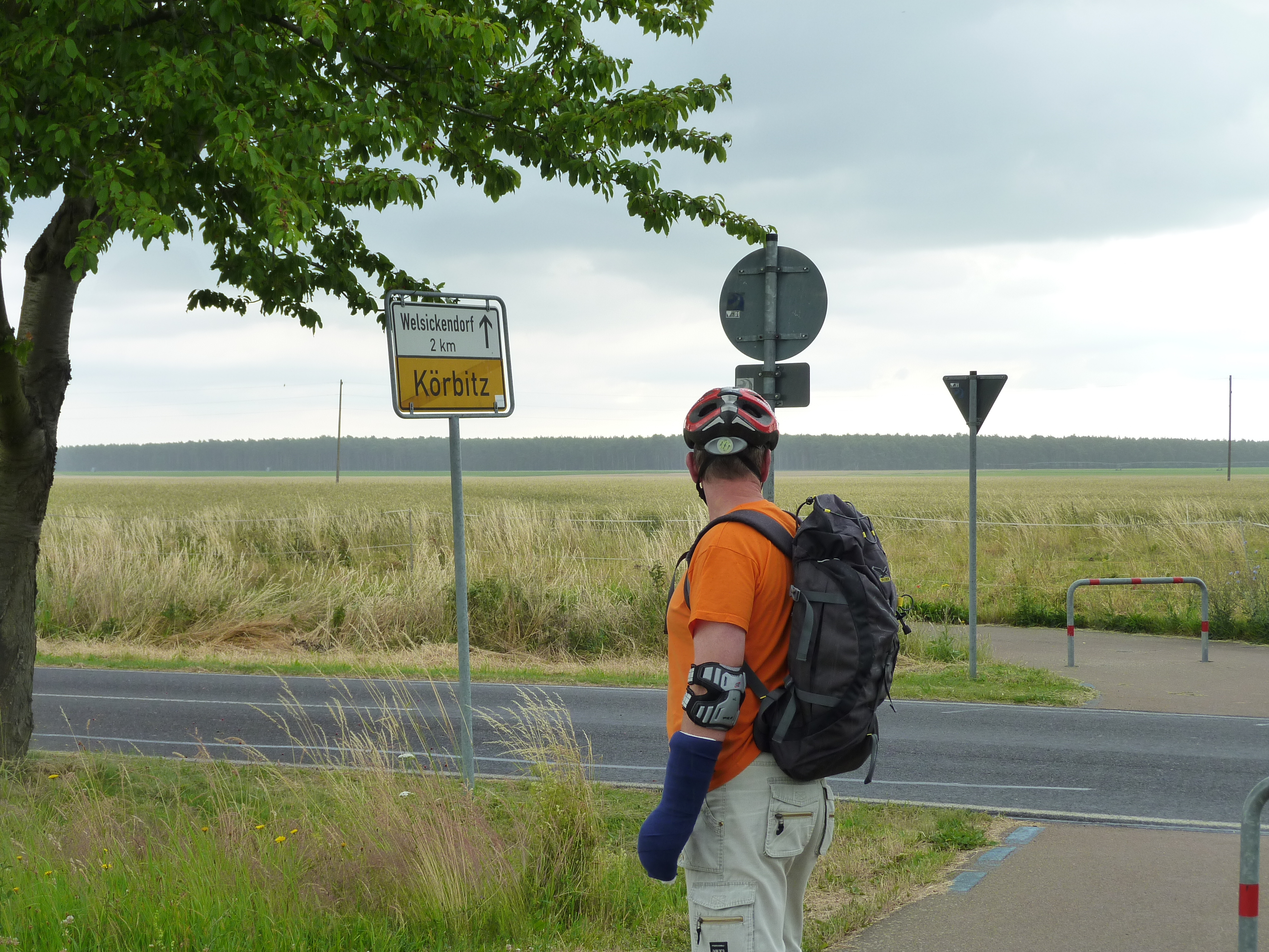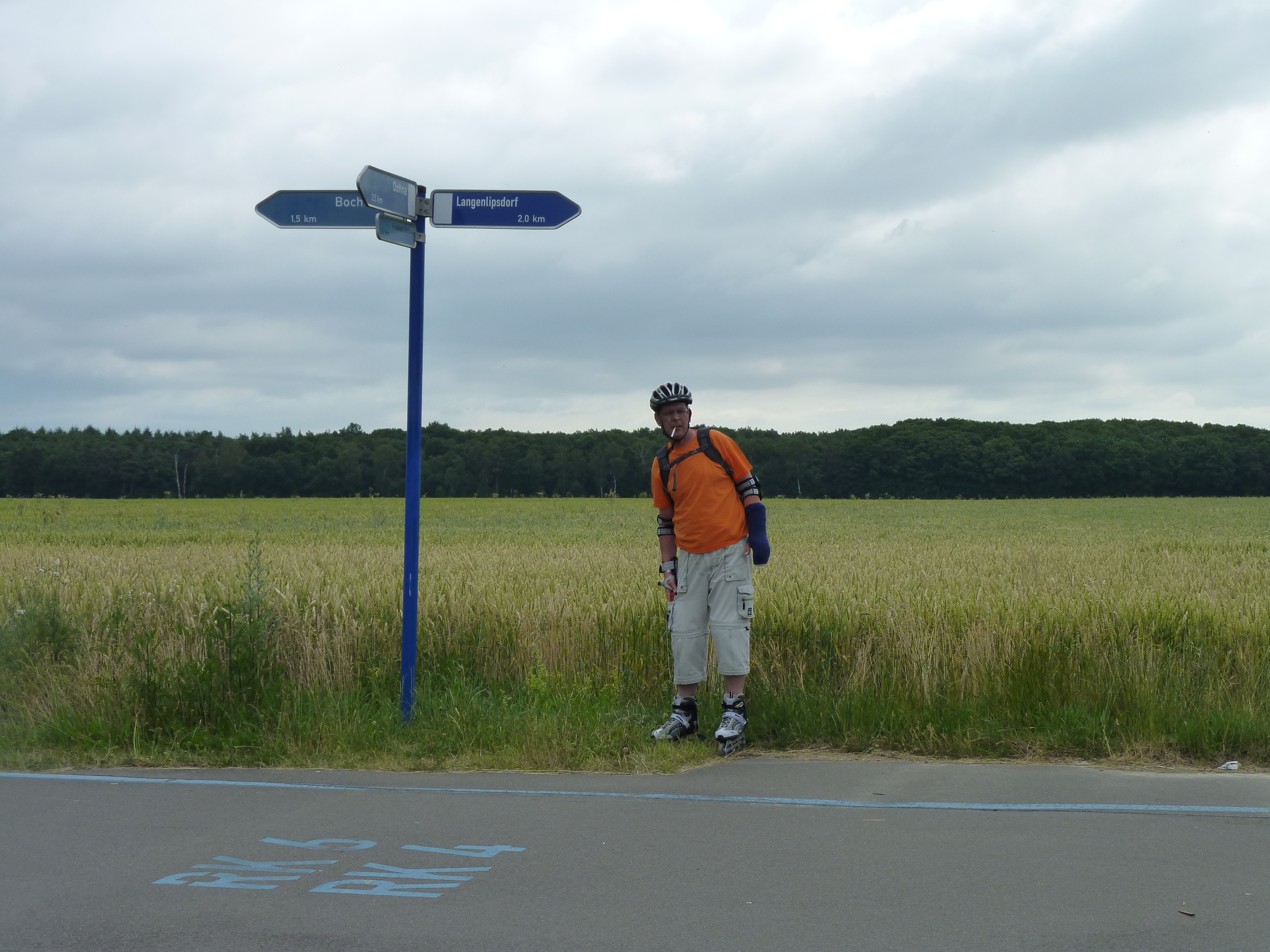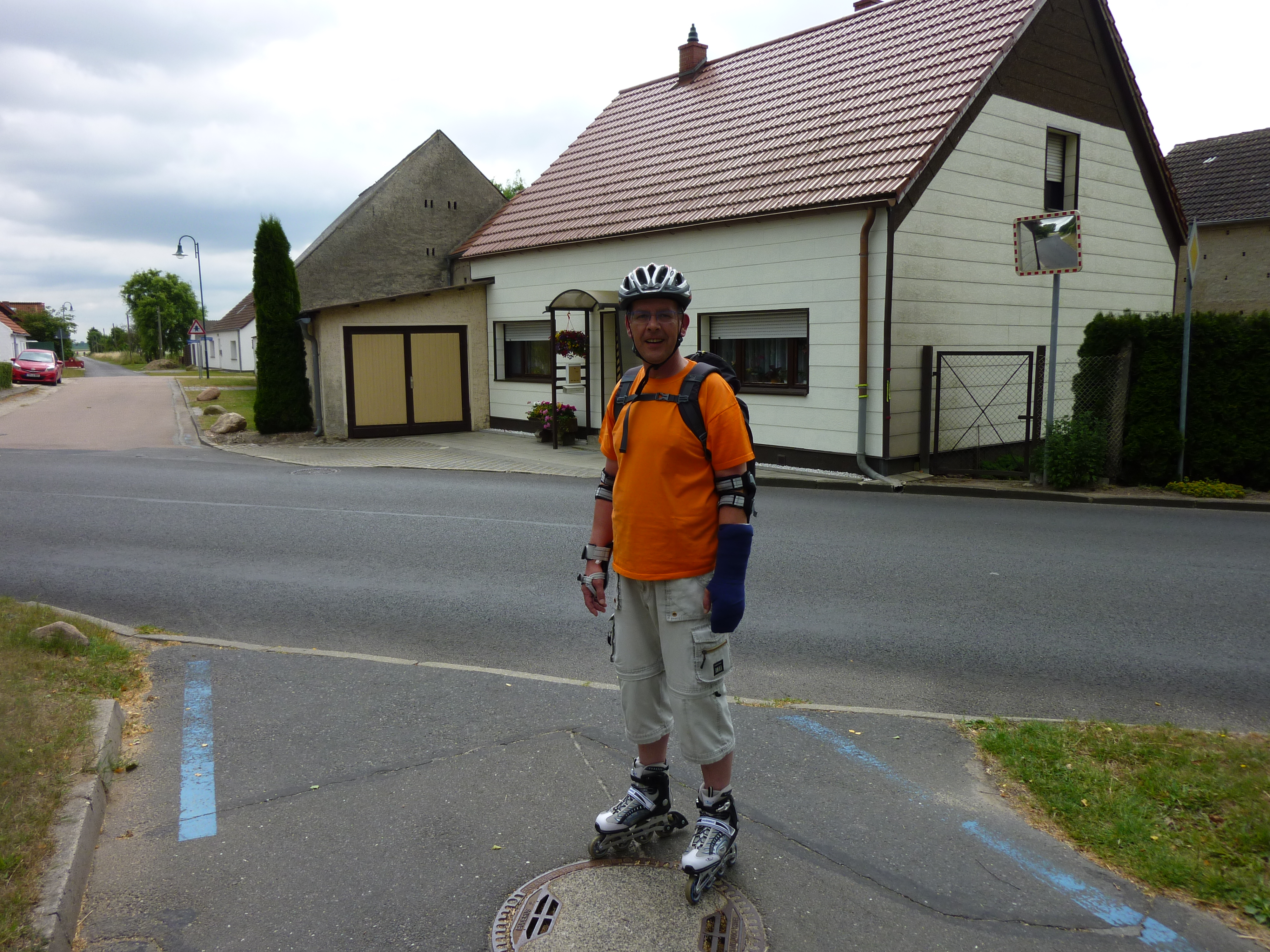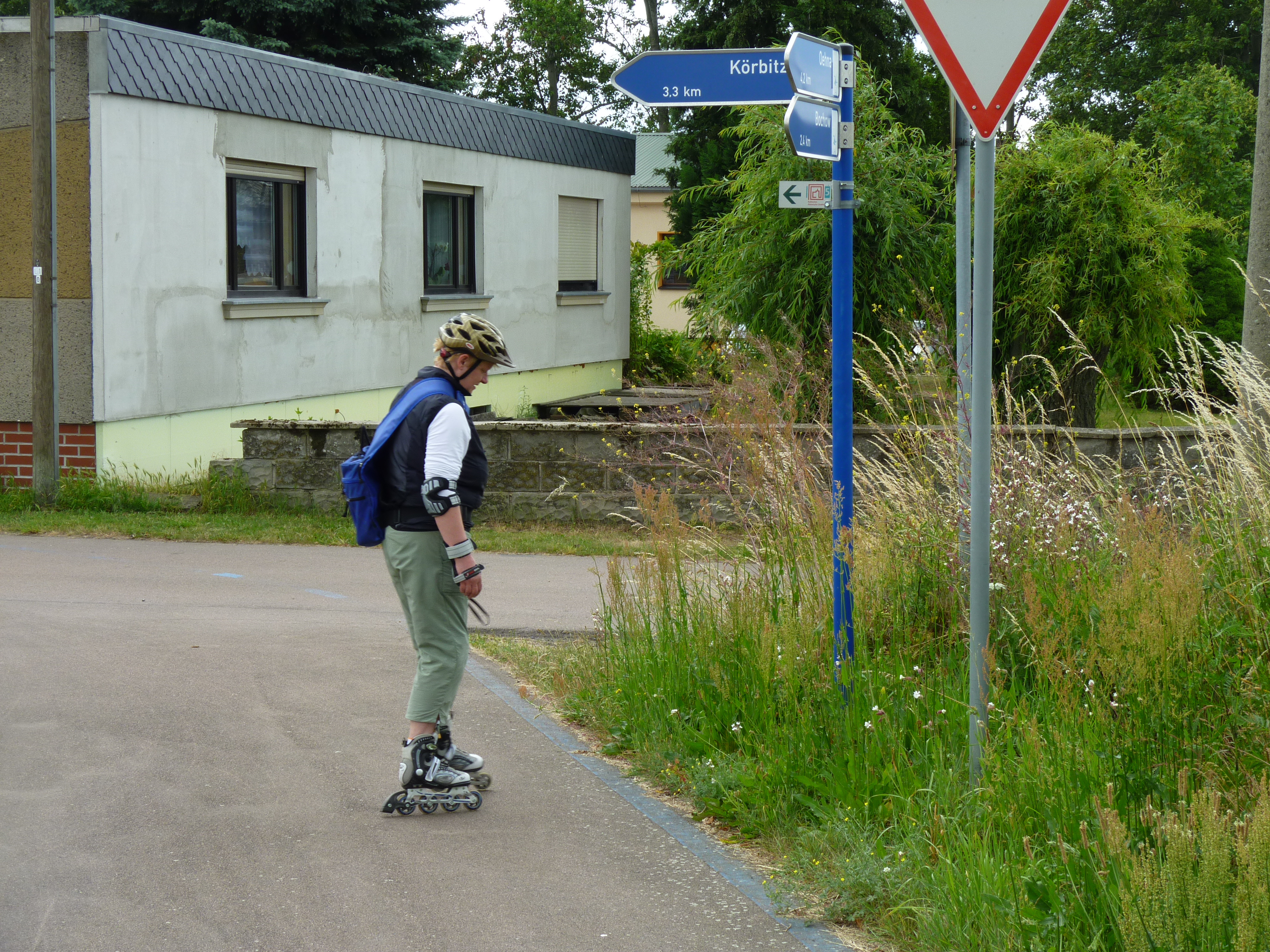 es ist ja gut gegangen. Leider führt der Radweg aus Reinsdorf nur auf der Hauptstraße weiter. Das kommt mit den Inlinern natürlich nicht in Frage. Also heißt es umkehren. Wieder zum