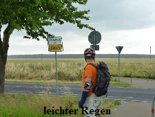 Als wir den Flugplatz passiert haben, beginnt es zur Abwechslung wieder mal an zu regnen. Wir fahren weiter und kommen bald nach Reinsdorf. Im Ort wird die Straße so