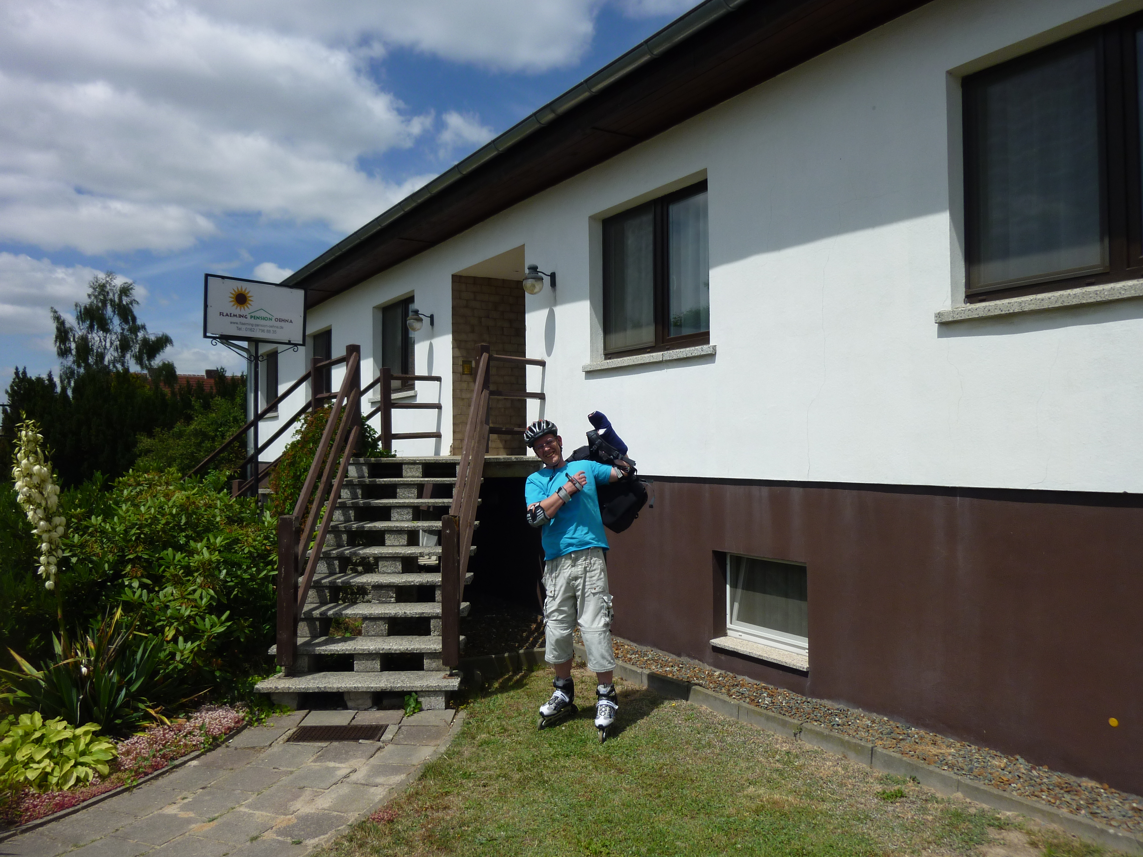 Fahrkarten organisiert. Zur Information muss hier noch erwähnt werden, dass wir im September 2013 angefangen haben, mit Inlineskates zu fahren. Man wird gleich mitbekommen warum ich das hier erwähne. Den langen schönen Herbst, den an sich milden Winter und das Frühjahr haben wir genutzt, um an unserer Fitness zu arbeiten. Dazu gehörte einmal das Radfahren und dazu kam noch das Fahren mit den Inlinern. Wenn es unsere Zeit erlaubt hat, sind wir dann immer nach der Arbeit eine Stunde unterwegs gewesen. Und schließlich kam es so, wie es zu erwarten war. Eine Woche vor Urlaubsanfang haben wir noch einmal Rasen gemäht und sind danach noch los gefahren, um noch eine Stunde Inliner zu fahren. Noch am Auto stehend, zog es mir ein Bein weg und schon lag ich auf der Nase. Habe noch versucht mich mit einer Hand abzustützen. Gemerkt habe ich noch nichts weiter außer, dass drei Finger der linken Hand ganz leicht geschmerzt haben. Wir sind dann unsere Stunde gerollert und dann nach Hause. Als ich am Freitag Morgen aufgestanden bin, habe ich das Dilemma gesehen. Drei Finger der linken Hand dick und blau. Faust konnte ich auch keine machen. So sind wir noch vor der Arbeit zum Arzt gefahren. Erst röntgen und dann zum Doktor. Es stellte sich heraus, dass zwei Finger stark gestaucht waren und am Ringfinger ist die Gelenkkapsel gerissen. So wurde meine Hand in Gips gelegt und damit war die Urlaubstour erledigt. Nun hieß es neu planen. Erst einmal den Krankenschein auf Arbeit abgeben. Zu Hause setzen wir uns leicht deprimiert zusammen, um einen neuen Plan zu fassen. Ich hatte vor einiger Zeit im I-Net etwas über eine Inlinerstrecke in Brandenburg gelesen. Das nennt sich Fläming-Skate und soll Einzelstrecken mit zusammen über 200 km Länge haben und eine Pension direkt an der Strecke soll auch existieren. Schnell steht der Plan dorthin zu fahren und ein paar Tage dort zu verbringen. Es wurde telefonisch gebucht.