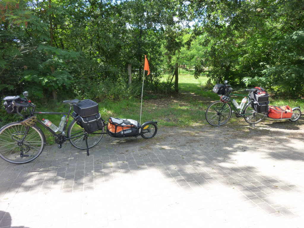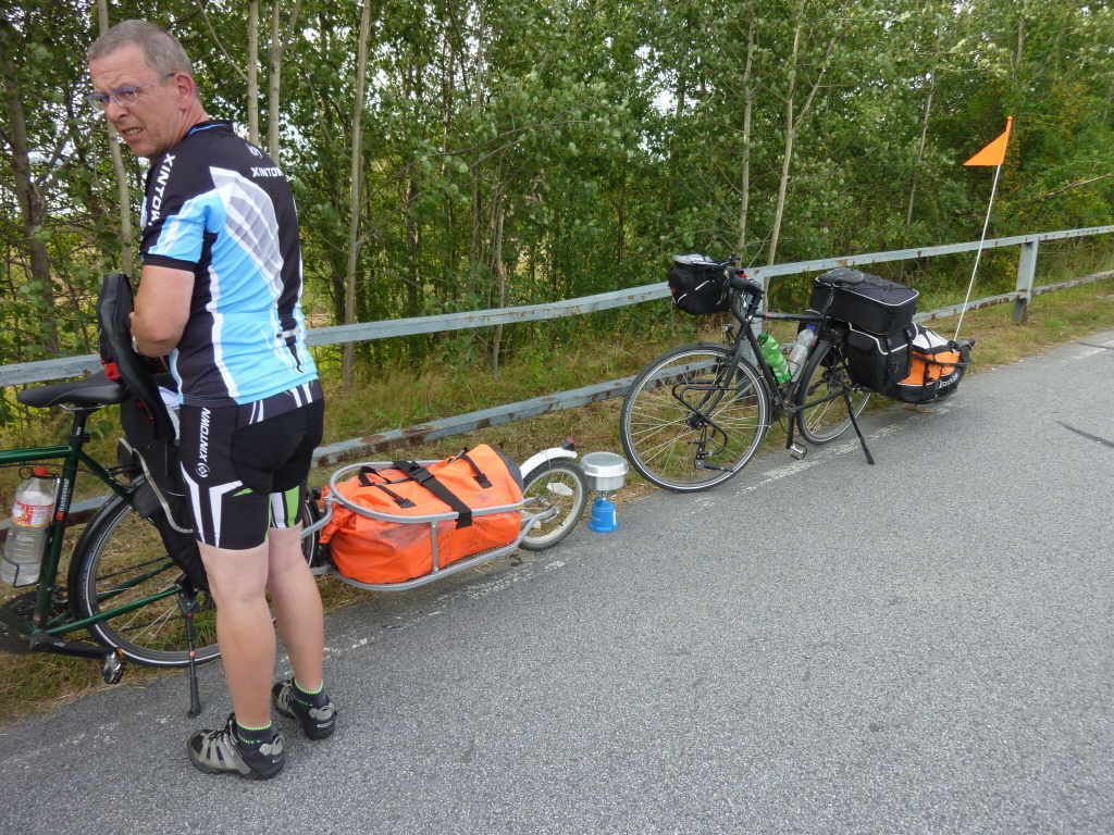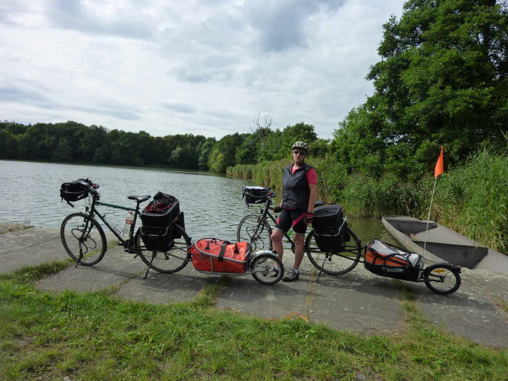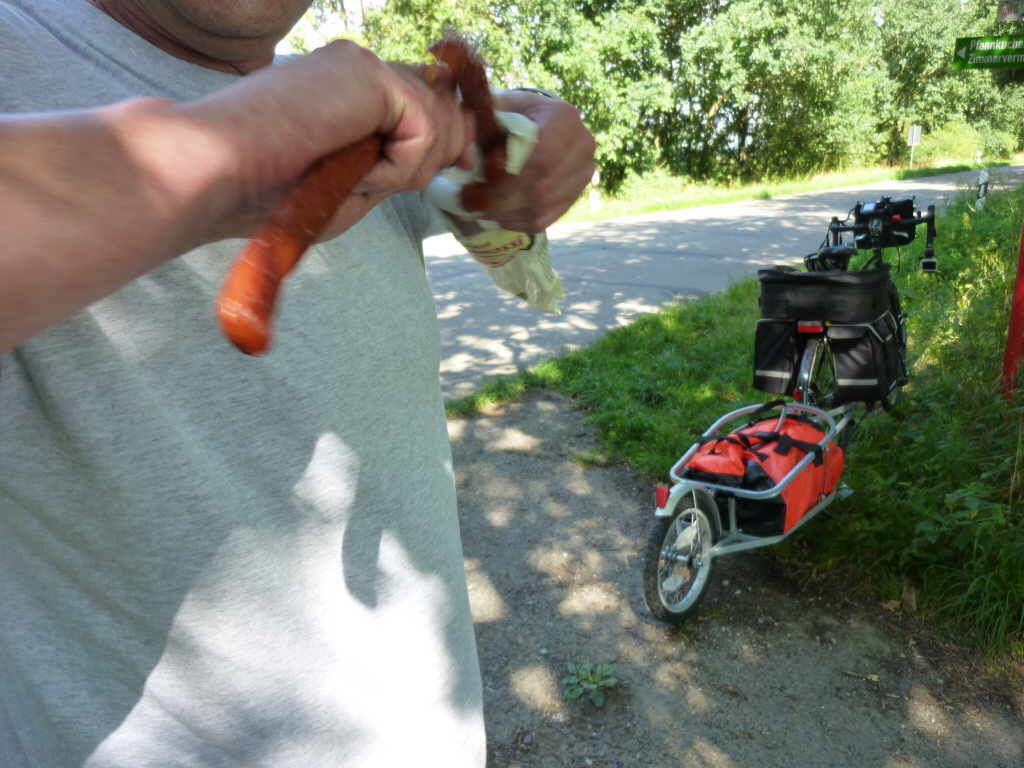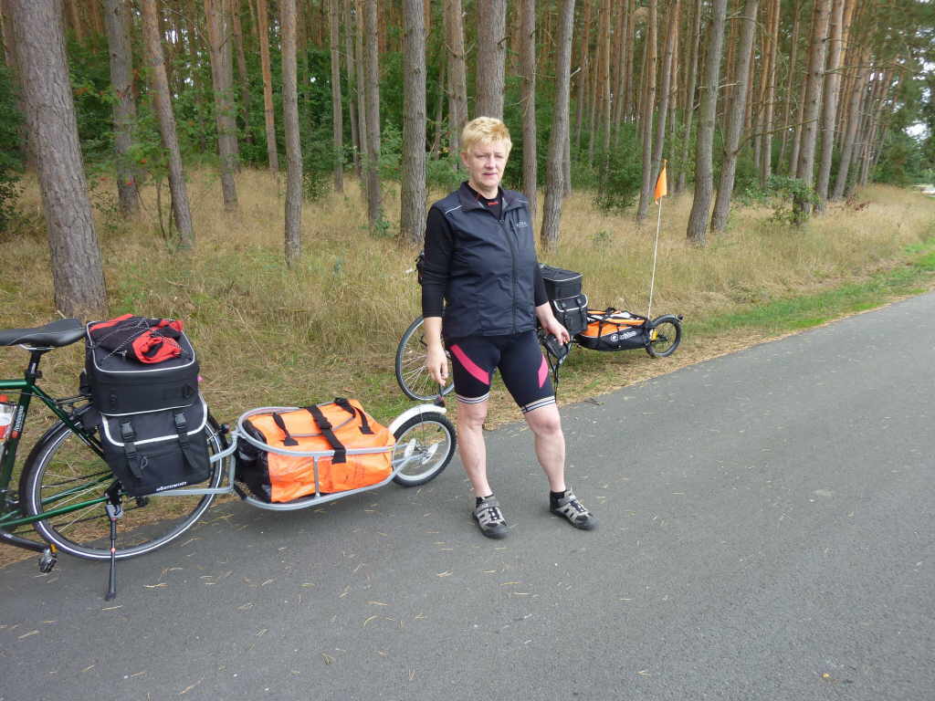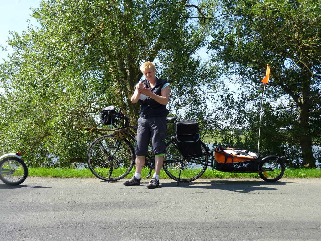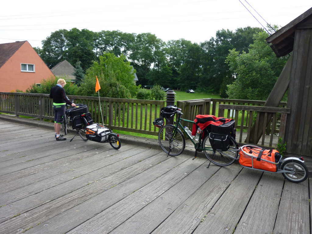 dieses Mal packen. Bei Fehrow machen wir eine Pause und werden dort von einer sehr netten Frau auf unsere Ausrüstung, insbesondere auf die Anhänger, angesprochen. Wir quatschen eine