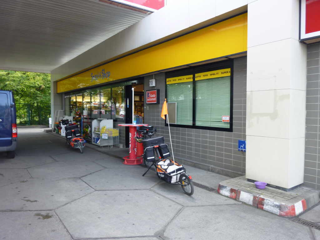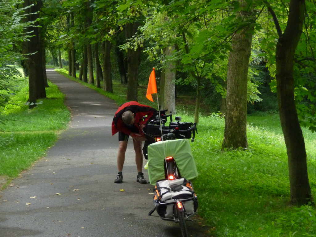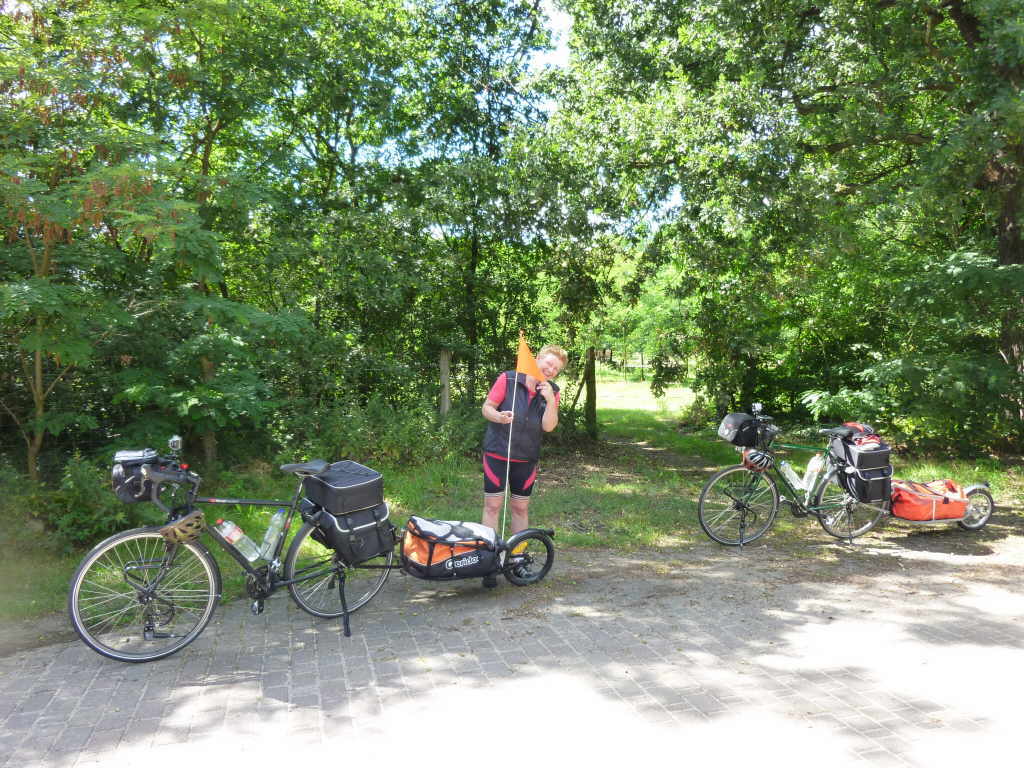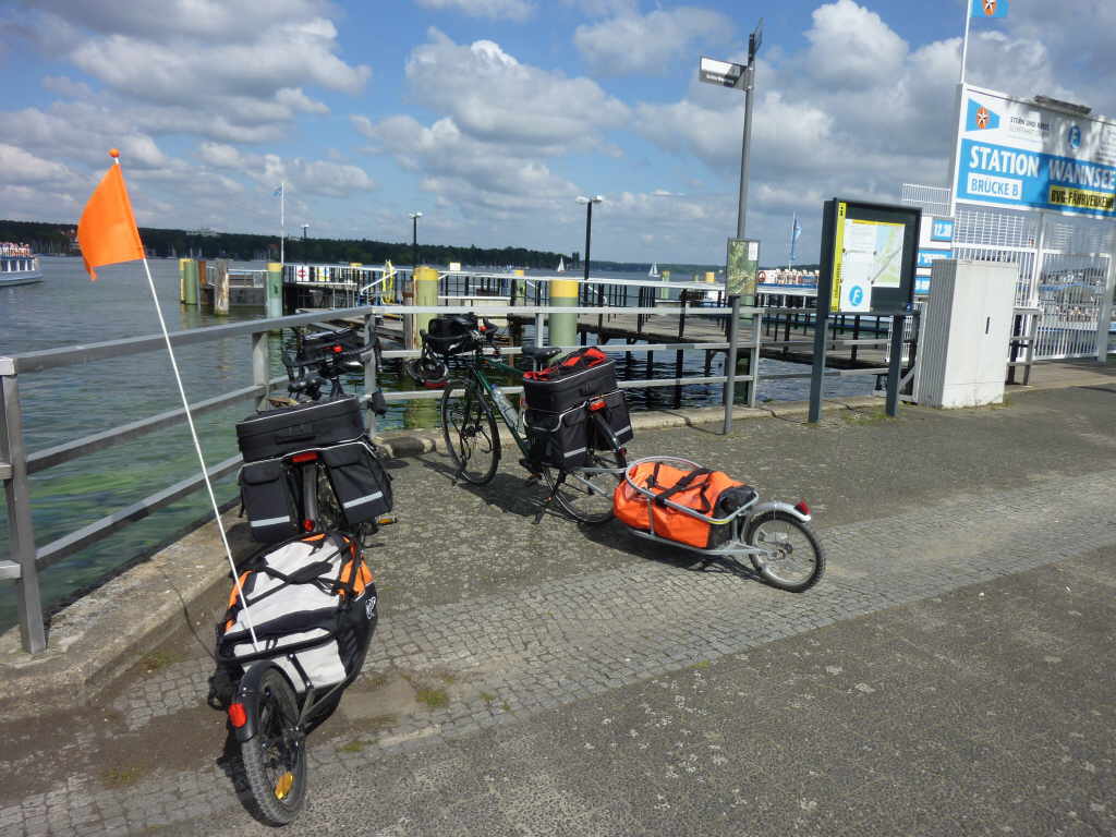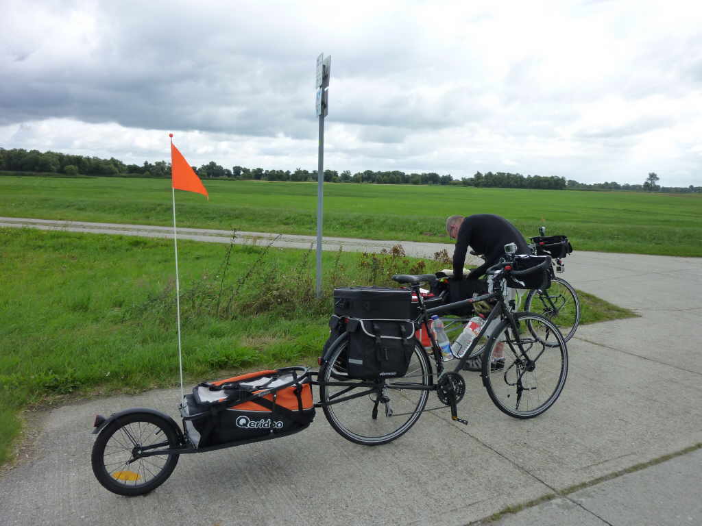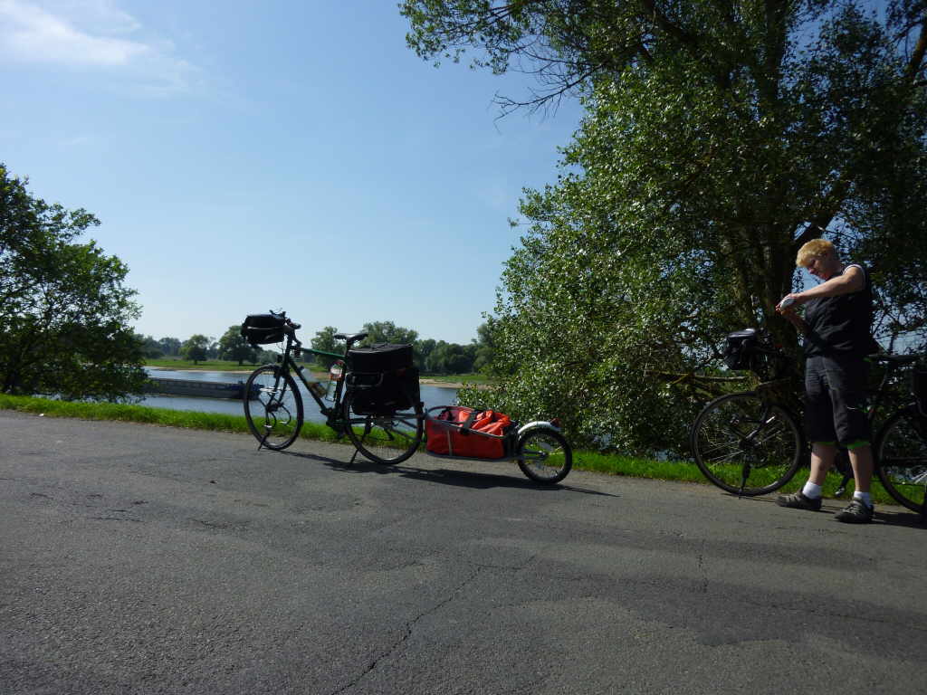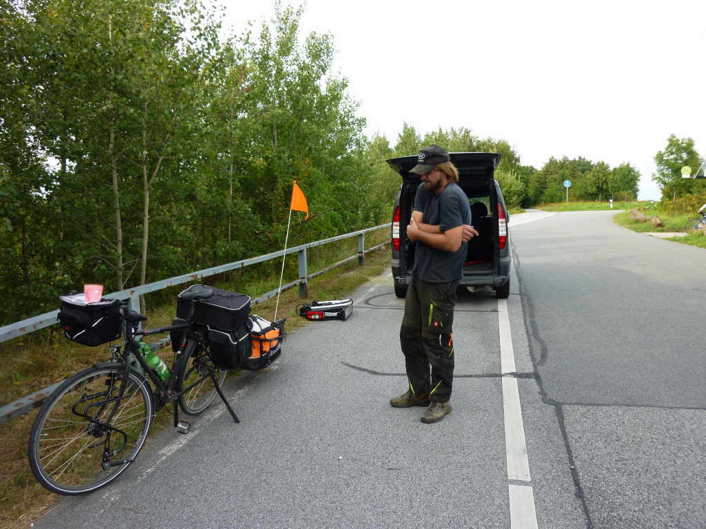 dieses Mal packen. Bei Fehrow machen wir eine Pause und werden dort von einer sehr netten Frau auf unsere Ausrüstung, insbesondere auf die Anhänger, angesprochen. Wir quatschen eine