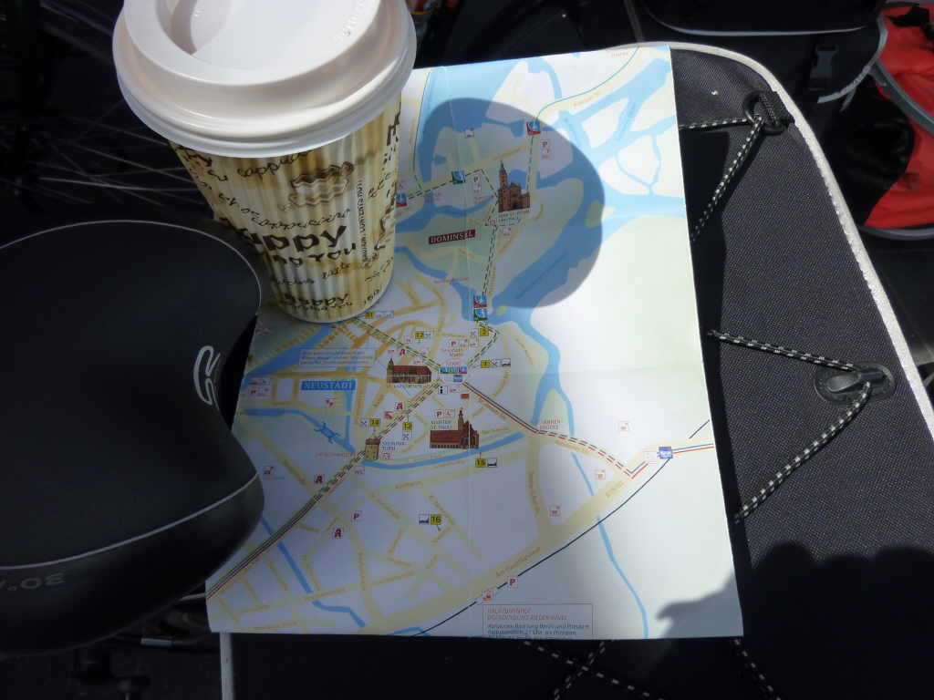einen Tip und eine Radkarte, damit wir am nächsten Morgen in Brandenburg einen Fahrradservice finden können, um Ines ihre Schaltung reparieren zu lassen. Wir sind sehr dankbar und
