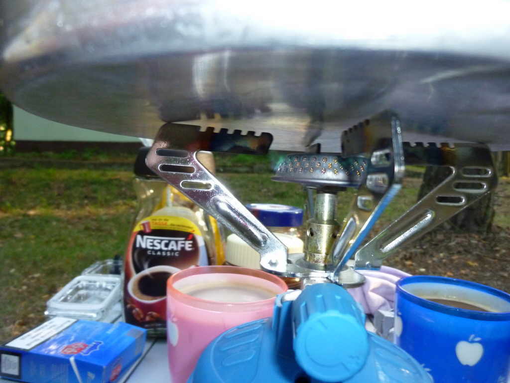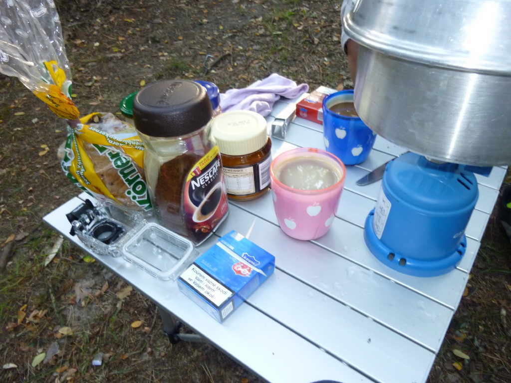 Wir stehen um 06:45 Uhr auf. Gehen uns zuerst waschen und dann frühstücken wir. Während das Kaffeewasser kocht räumen wir schon mal unsere Sachen zusammen bis nur noch das Außenzelt steht.