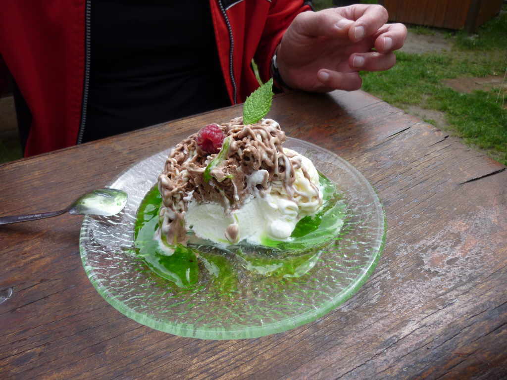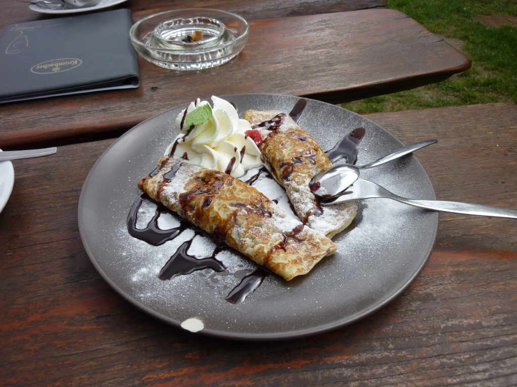 Kaffee, für Ines heiße Plinse mit Heidelbeeren und Holger isst ein leckeres Eis mit Waldmeistersirup.