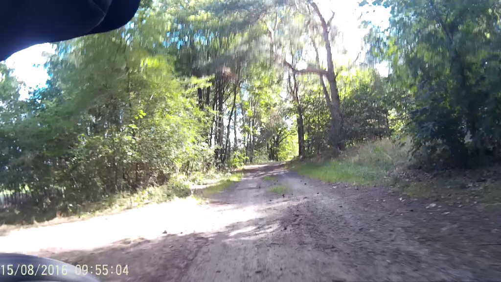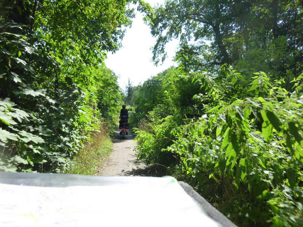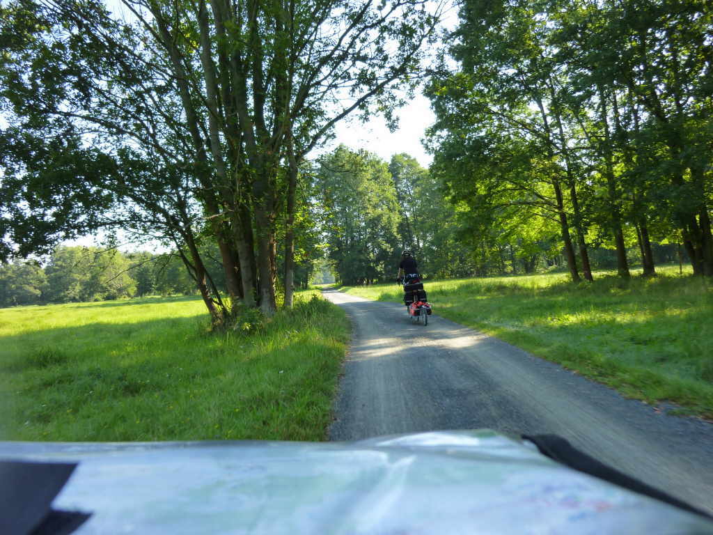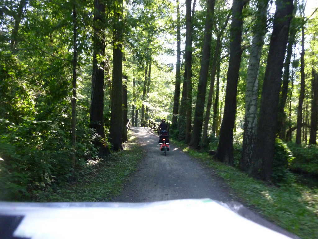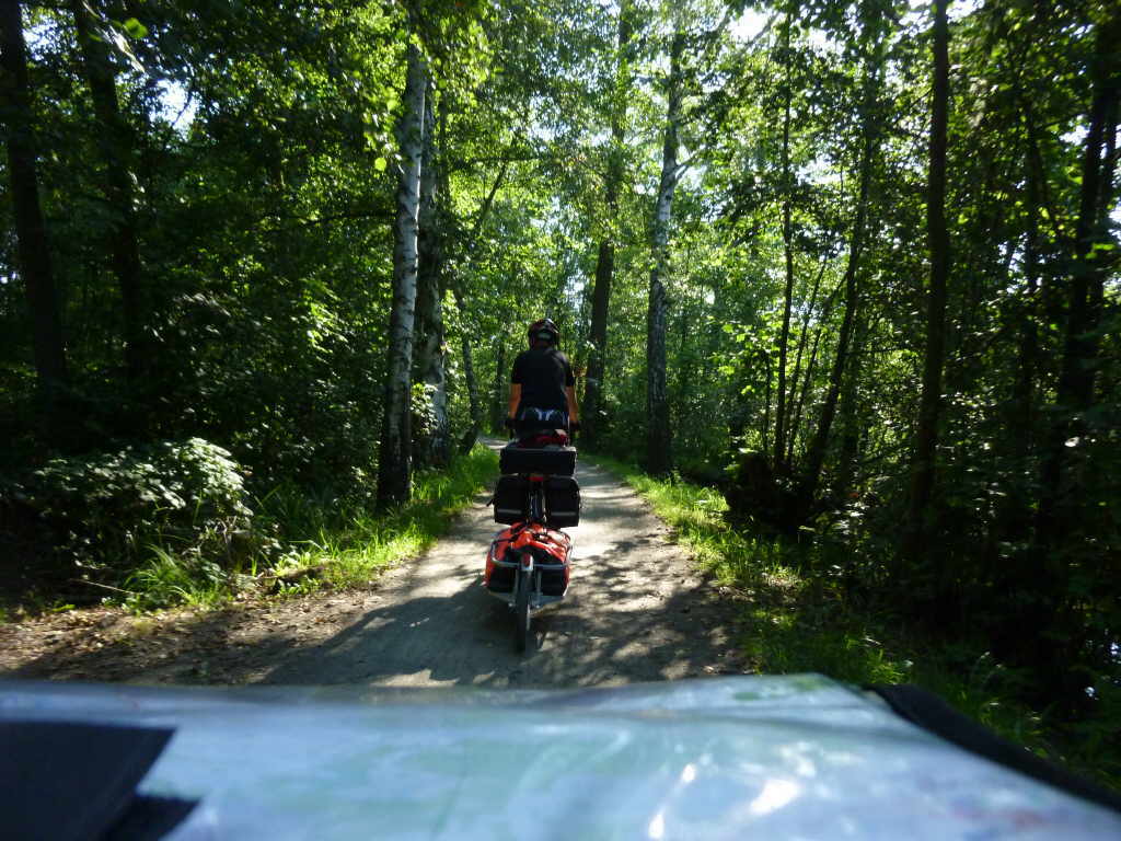 später. Weiter führt uns der Weg aus der Stadt. Nun fahren wir viel durch den Wald. Teilweise auf fürchterlichen Rüttelpisten. Vor allem weil die Baumwurzeln den Asphalt aufbrechen. Bei