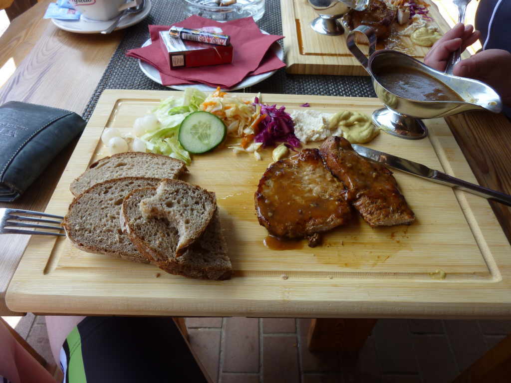Essen ist richtig super. Eingelegtes Steak mit Senf, Meerrettich, Brot und Kümmelsoße. Dazu Beilage aus Gurken und Salat. Oh, war das lecker. Wir lassen uns Zeit, da es bis zum Ziel nur