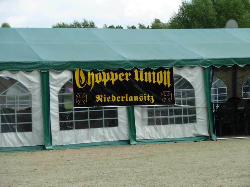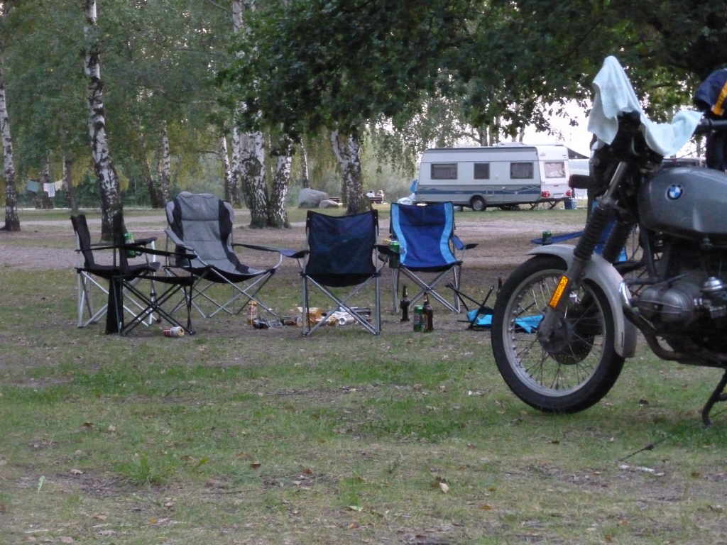 Motorräder abgestellt sind, Stühle raus und erst einmal ein Bier zischen. Na ja, wem es schmeckt. Nach dem ersten folgt gleich das zweite Bier. Dann machen sie sich an den Aufbau ihrer