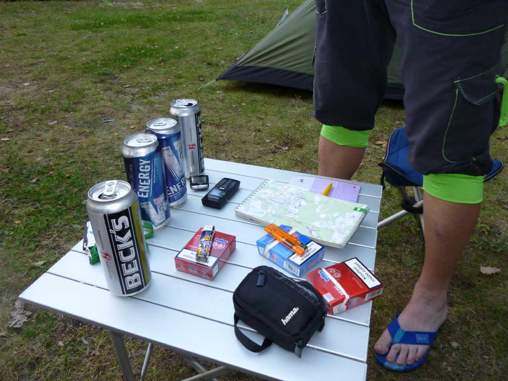 Nachdem das Zelt steht, fahren wir in den Ort um im REWE unsere Vorräte aufzufüllen. Leider gibt es kein Plastebier, wir müssen Büchsen kaufen. Ines bringt auch einen Snack