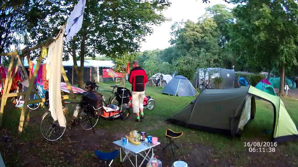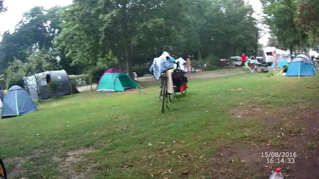 Radwanderer ein und stellen ihre Zelte auf. Aber voll wird der Zeltplatz nicht. So gegen 20:00 Uhr kommt eine ganze Ladung Kinder an. Die Erwachsenen scheinen die Übernachtung