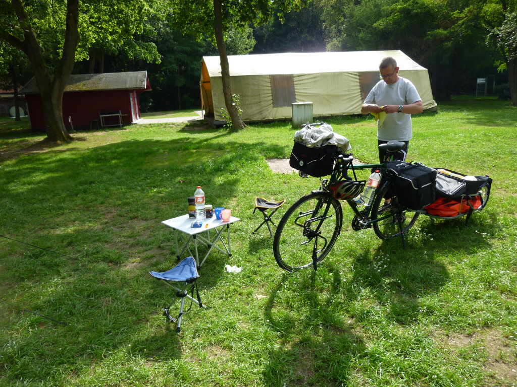 quatschen noch ein bisschen. Beim Abendessen kommen zwei Radler auf dem Platz an. Sie bauen ohne zu grüßen ihr Zelt auf und gehen sich duschen. Ich erinnere mich die Beiden schon in
