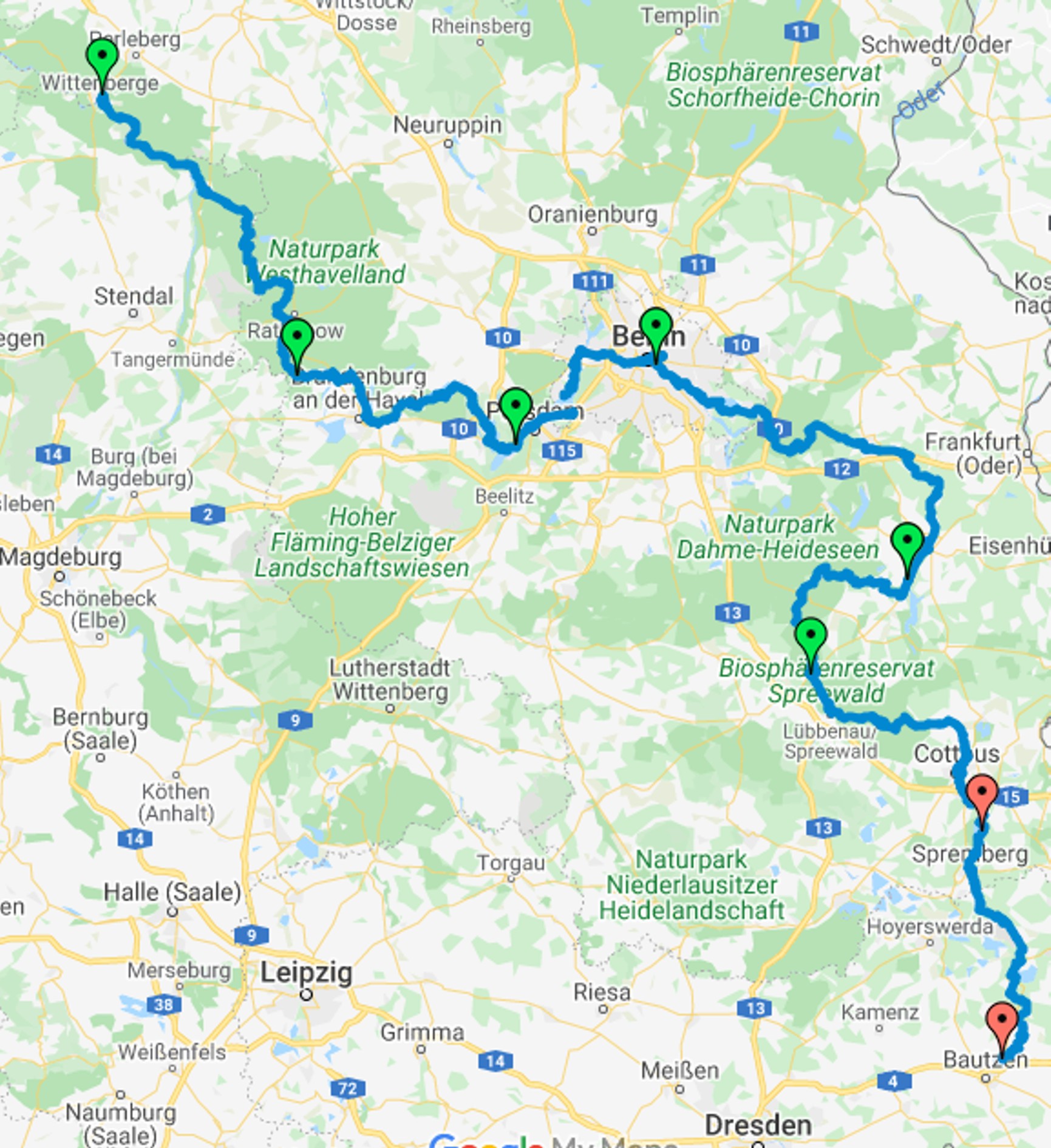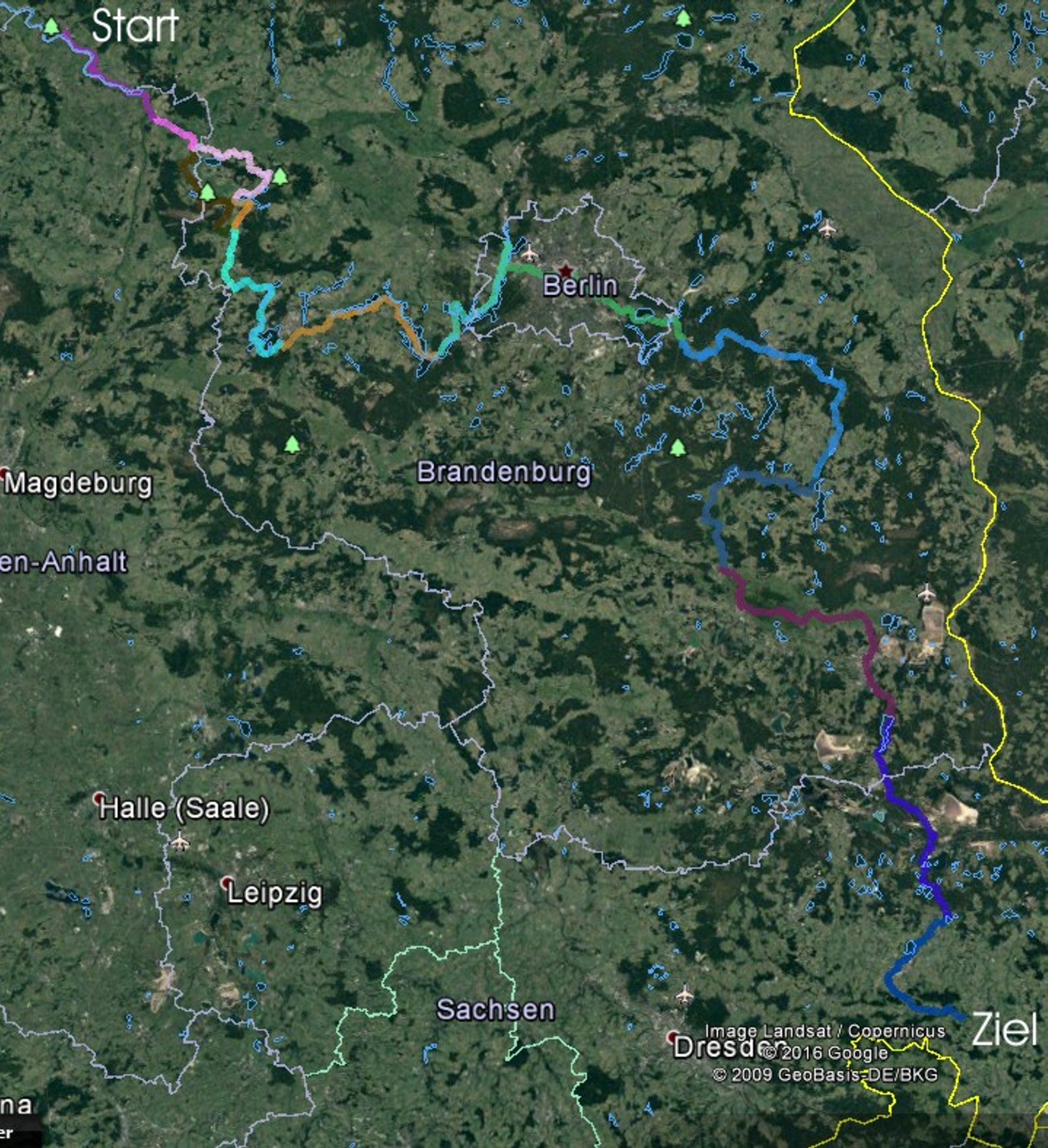 fahren und den Elbe- dann den Havel- und schlußendlich den Spree-Radweg zu fahren. Dies sollte dann folgende Route werden: