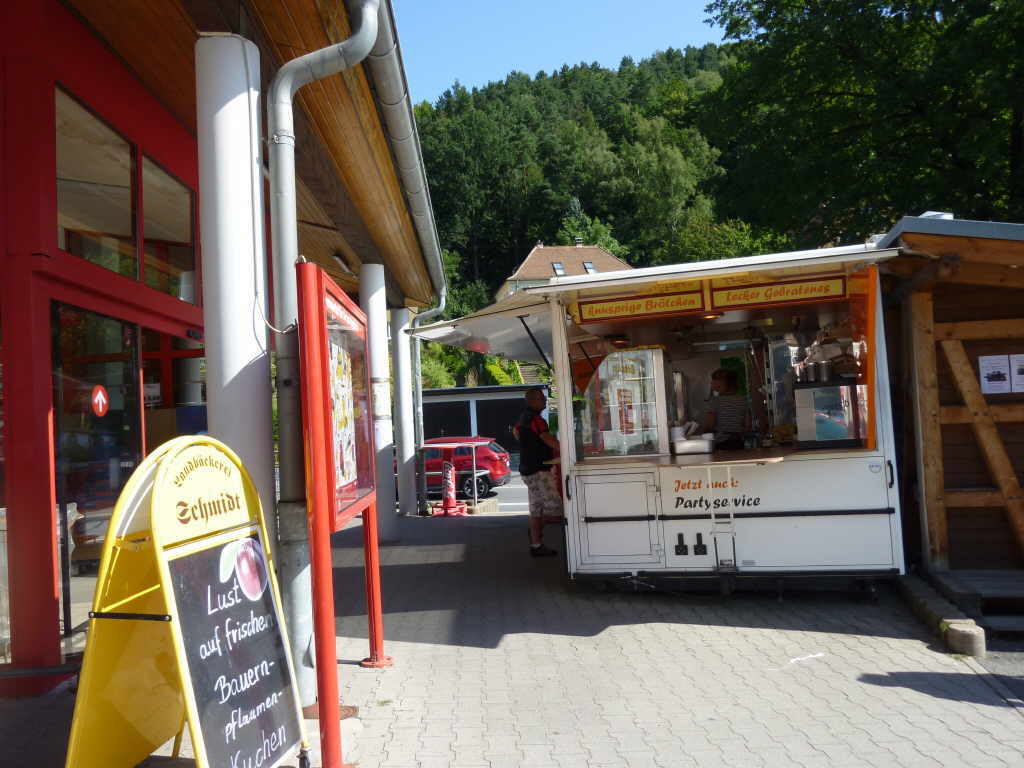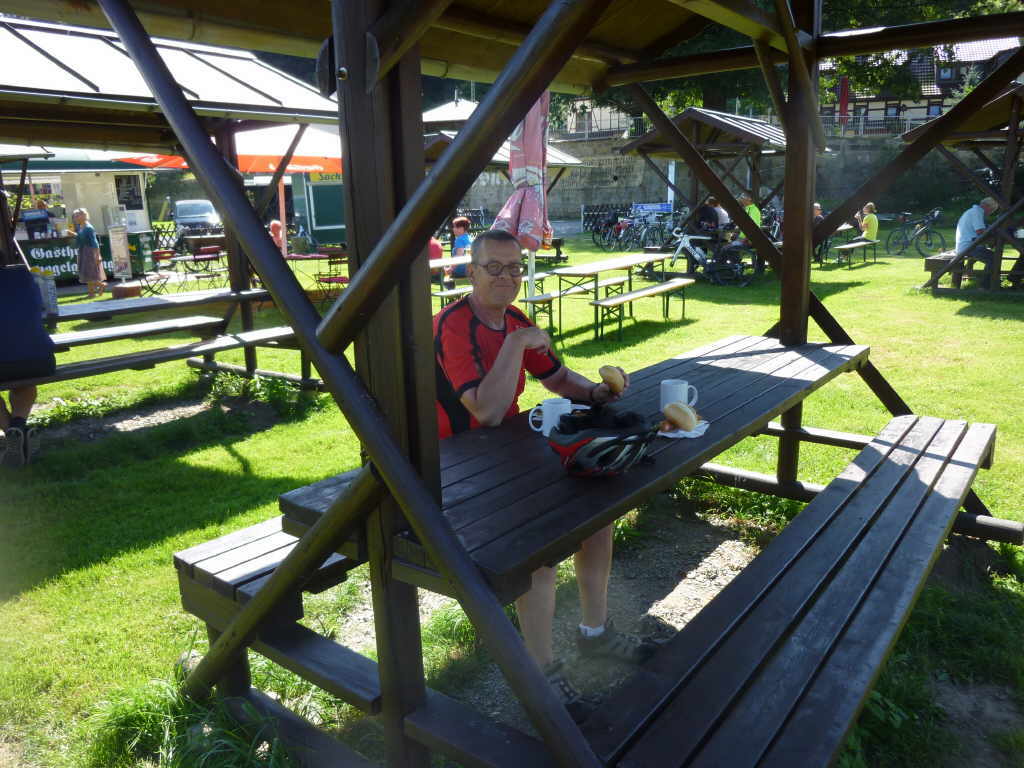 Am Ortsrand von Pirna machen wir Mittagspause. Wir essen eine Bratwurst und trinken einen Kaffee. Lange halten wir uns nicht auf und starten alsbald den Rückweg. Durch