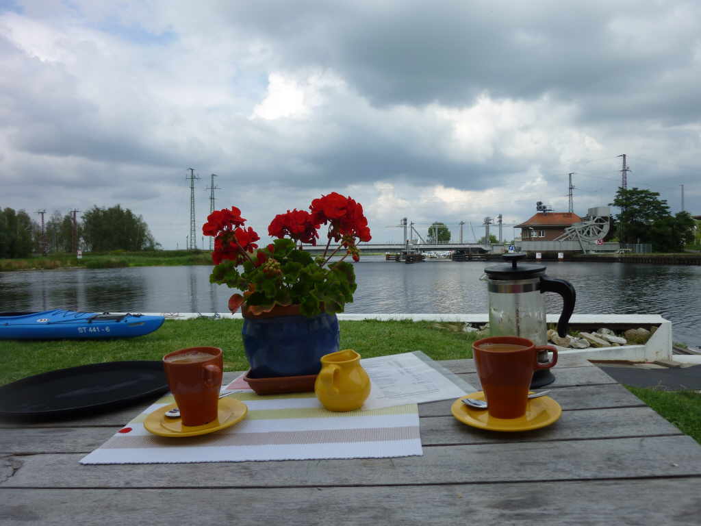 In Anklam nutzen wir die Zeit um noch einen Kaffee zu trinken und gönnen uns ein Softeis. Um 17:30 Uhr sind wir zurück. Wir gehen austreten und ziehen uns etwas