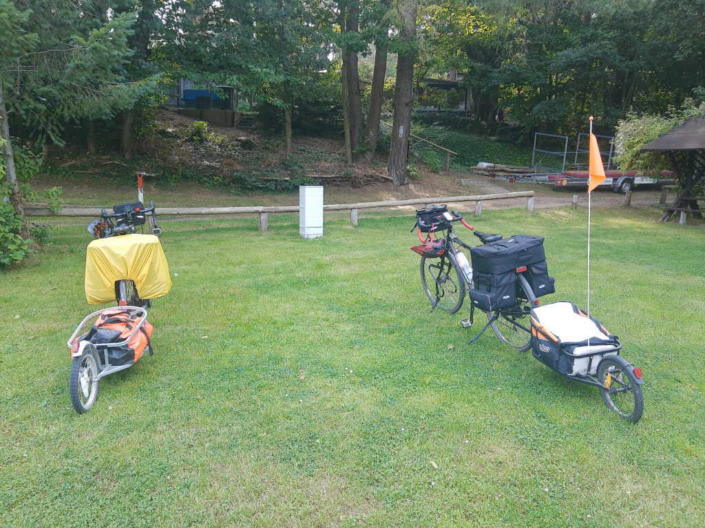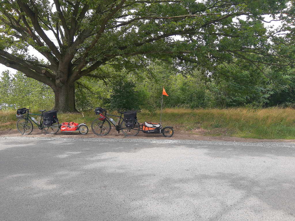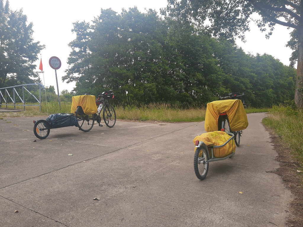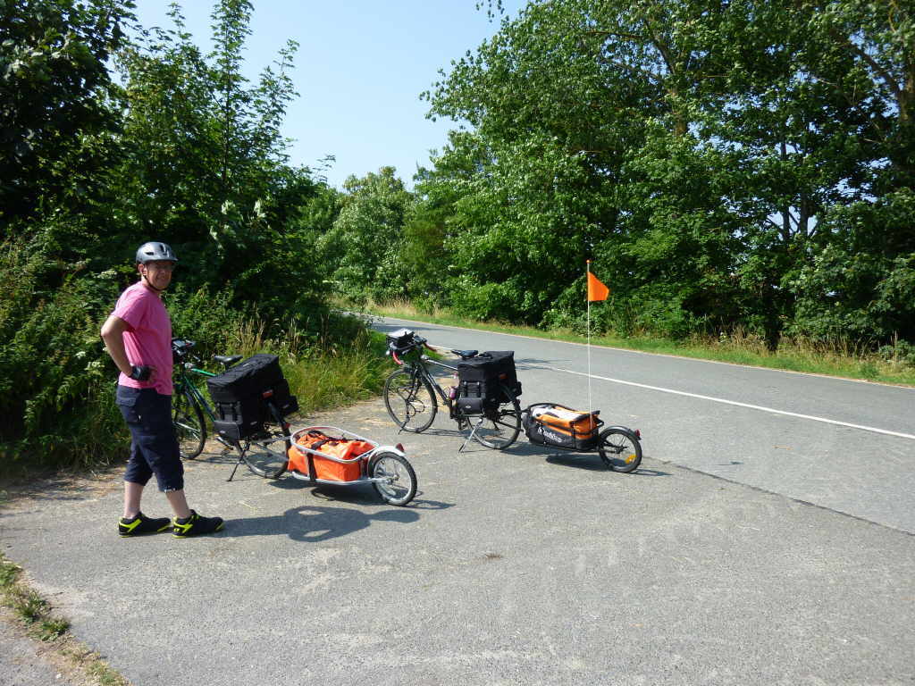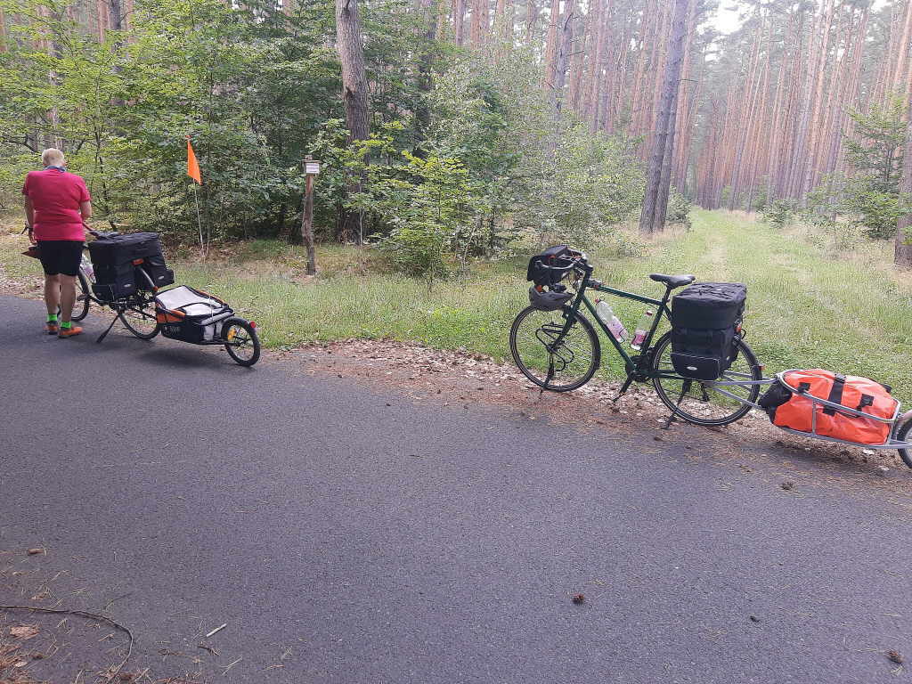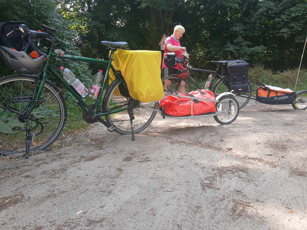 sind begeistert von unseren Anhängern und der doch für eine Fahrradtour komfortable Ausstattung. Ein Urlaubspaar aus Duisburg interessiert sich besonders für uns. Der Mann liebt den Osten