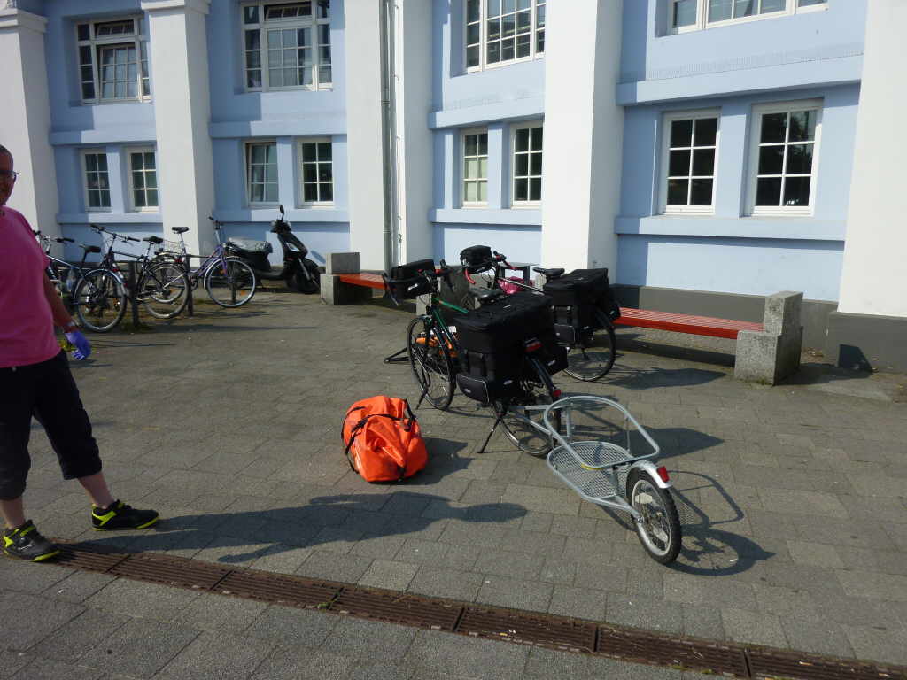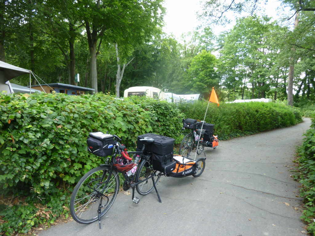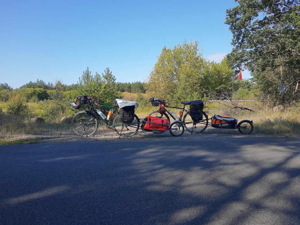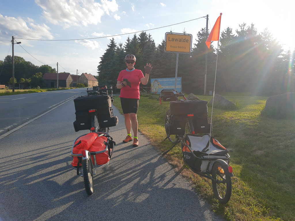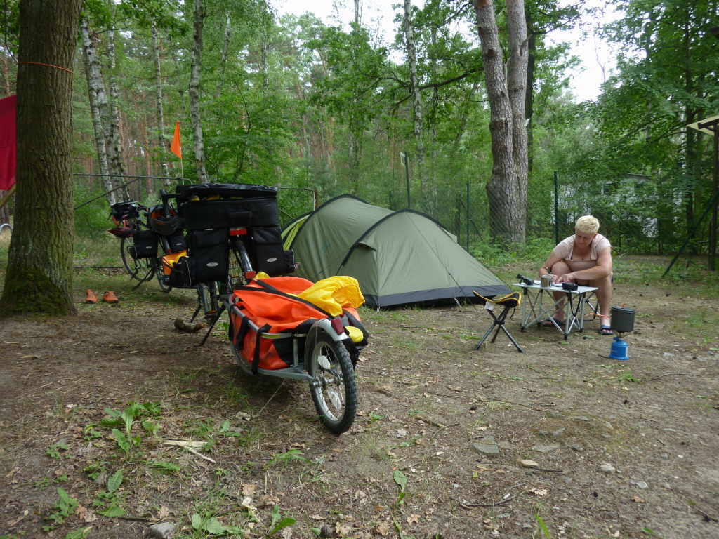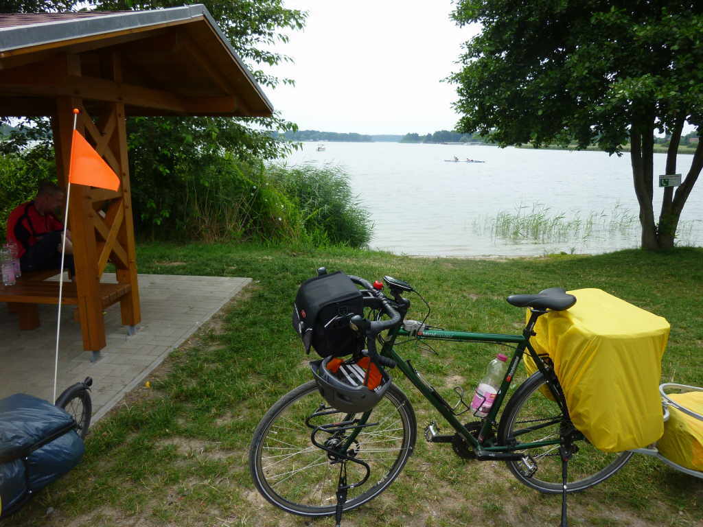 sind begeistert von unseren Anhängern und der doch für eine Fahrradtour komfortable Ausstattung. Ein Urlaubspaar aus Duisburg interessiert sich besonders für uns. Der Mann liebt den Osten