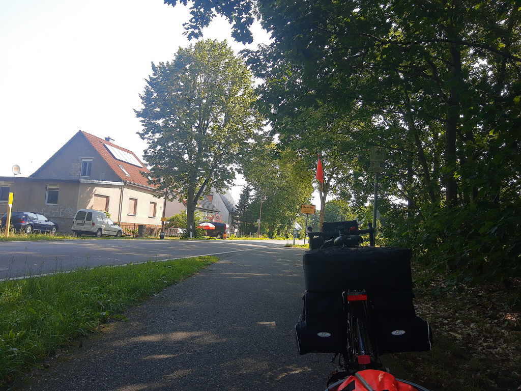 Jänkendorf. Von dort auf dem straßenbegleitenden Radweg weiter in Richtung Löbau. Auf den nächsten Metern fällt es Ines noch schwerer zu treten. An einer Gulf-Tankstelle trinken wir einen