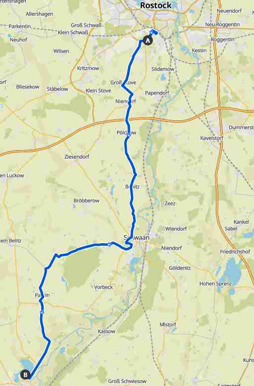 1. Etappe geplant: Rostock - Bützow 37 km gefahren: Rostock - Bützow 37 km