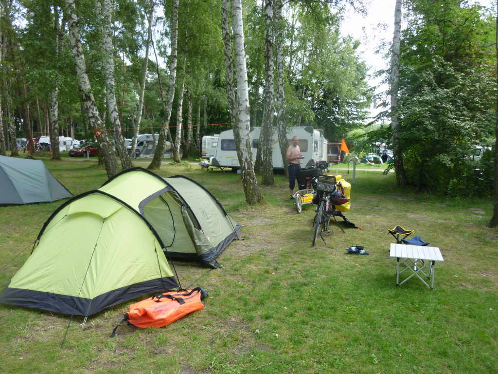 So erreichen wr den Gräbendorfer See, welchen wir noch fast bis zur Hälfte umrunden müssen um den Zeltplatz zu erreichen. Wir kommen gegen viertel Drei an. Der Zelt-