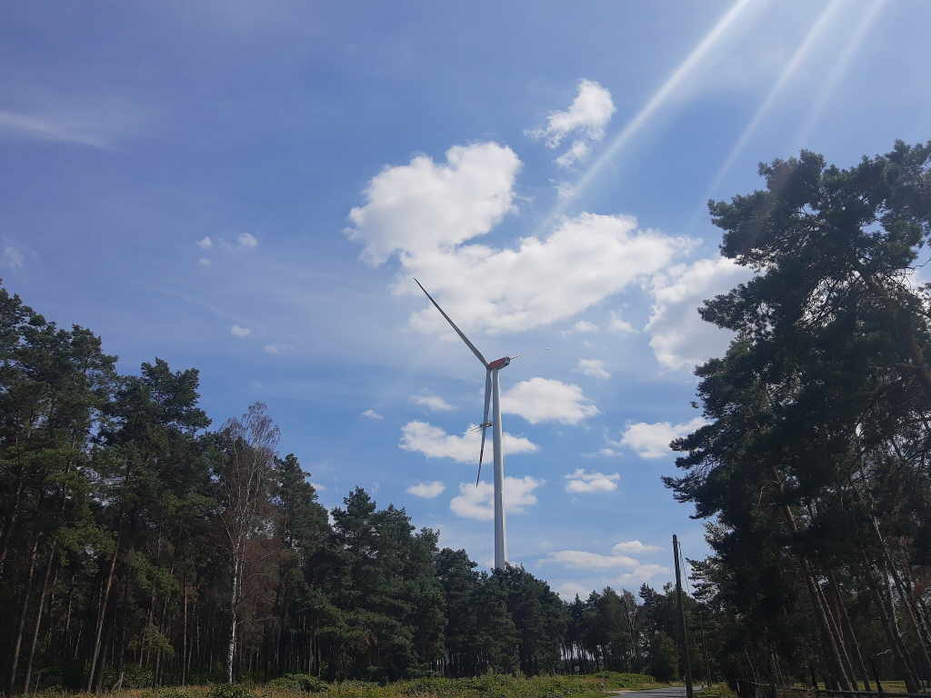 der Straße die z. Zt. höchsten Windräder Deutschlands. An einem der Räder arbeiten gerade ein paar Leute an den Rotoren. Irgenwie verrückt in der Höhe. Uns laufen leichte Schauer über den