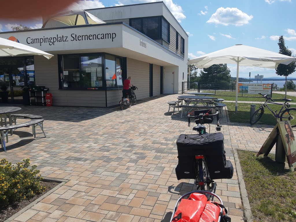 Während ich auf die Räder aufpasse geht Ines an die Rezeption um uns anzumelden. Es dauert eine Weile (Corona Maßnahmen). Ines bringt gleich für jeden einen Kaffee mit. Den
