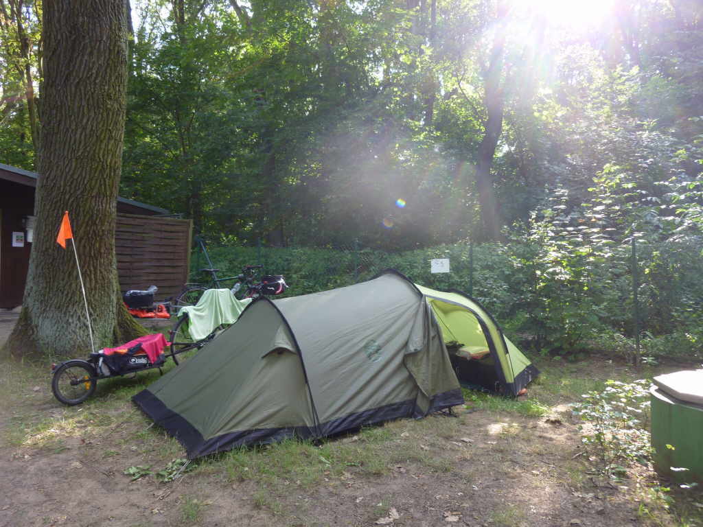 See, Container zur Verfügung. Im Gegensatz zum Geierswalder See, können wir das Zelt auf einer Wiese auftsellen undes stehen Schatten spendende Bäume auf dem Stellplatz. Wir bauen auf und