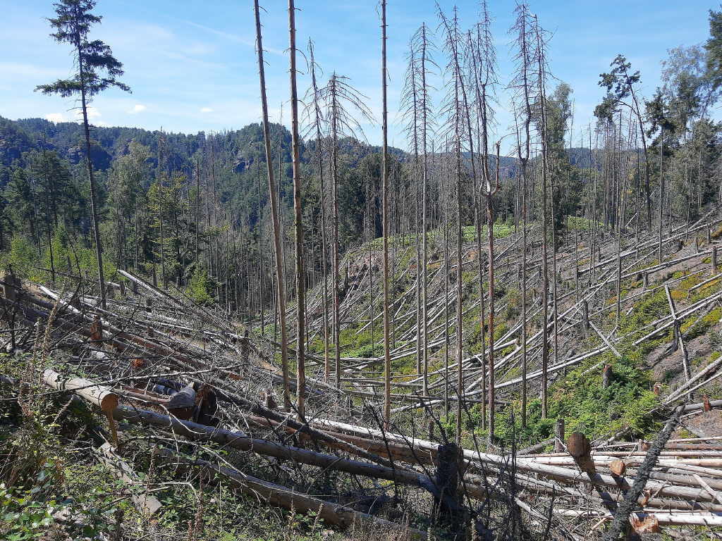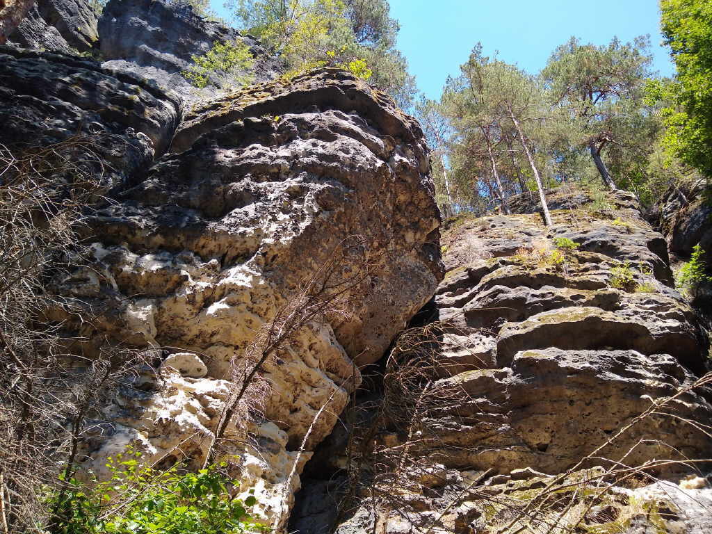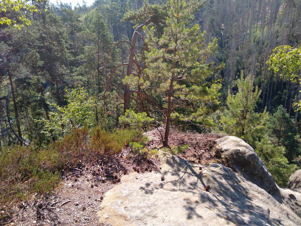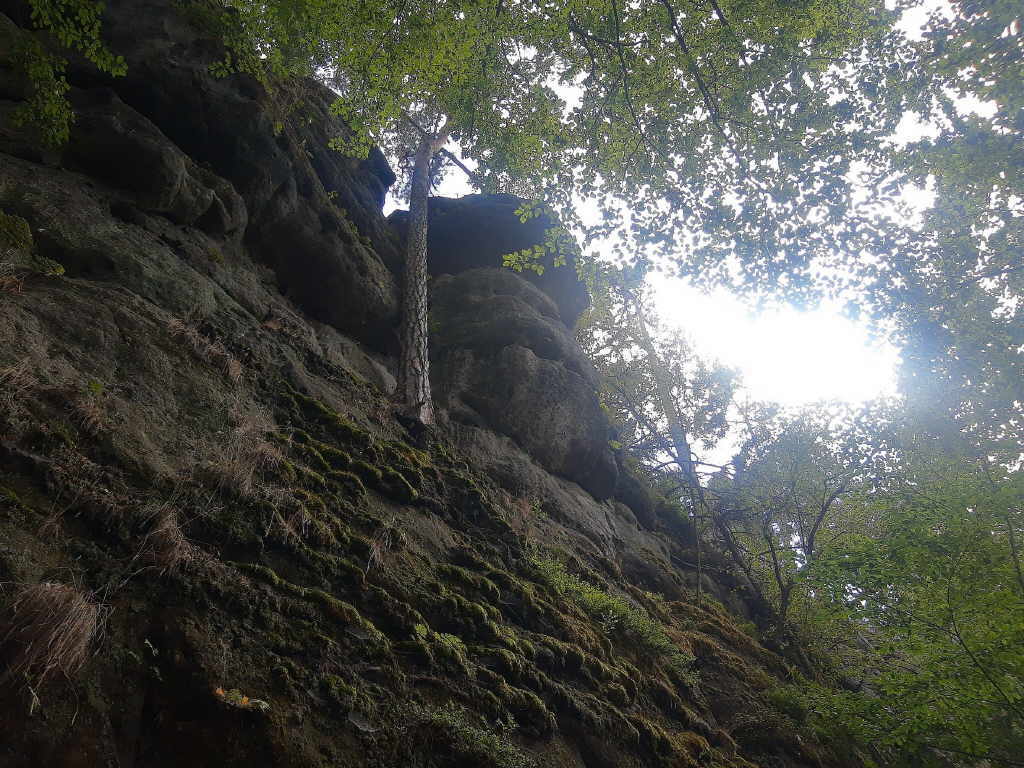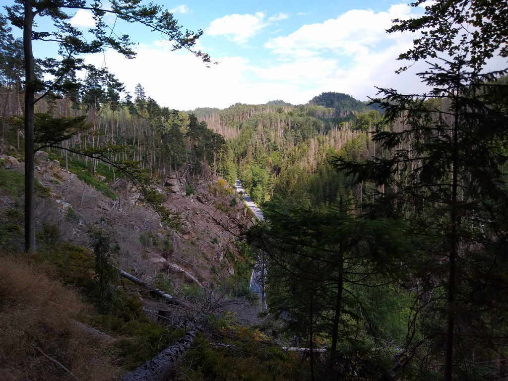 Felsformation von der Neumannmühle zur Hickelhöhle entlang. Er bietet eine wunderschöne Aussicht auf Felsen und, nach dem Borkenkäfer auch wieder auf den Wald. In einigen Wanderführern