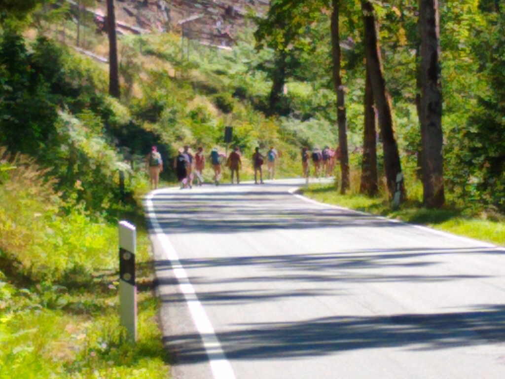Gruppe Nacktwanderer. Wir müssen ein kurzes Stück an der Straße laufen um dann nach rechts abzubiegen und auf den Malerweg zu gelangen, welcher wieder steil nach oben führt. Erleichtert