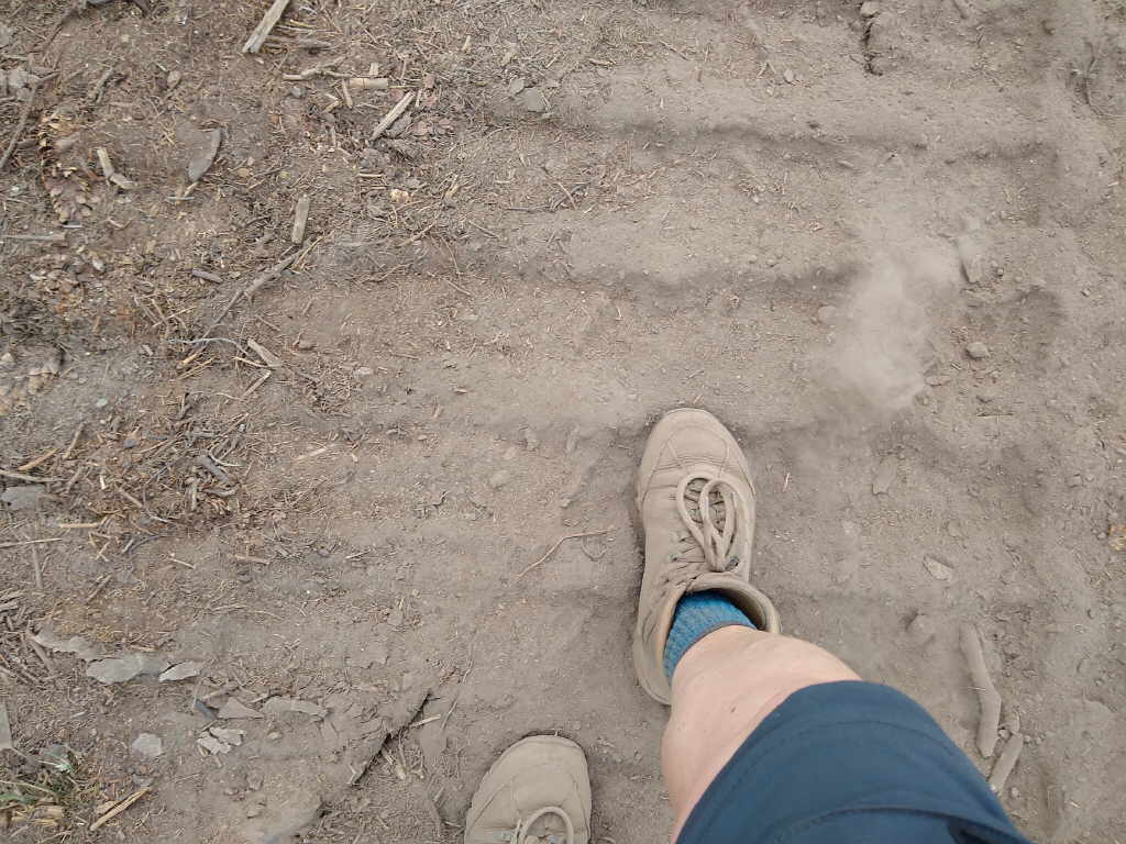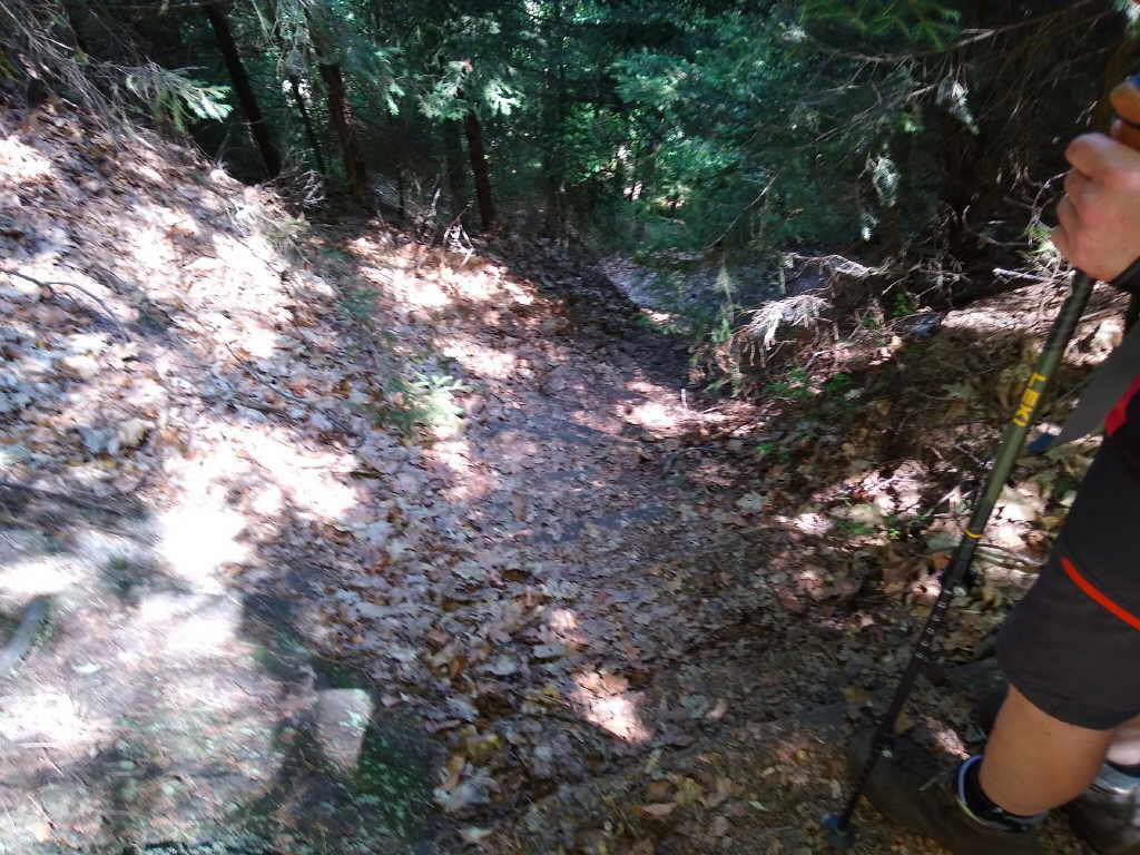 Der Abstieg vom Wachberg gestaltet sich nach einer Weile recht schwierig. Durch die Holzerntemaschinen und die anhaltende Trockenheit ist es sehr sandig. Streckenweise ist es auch ziemlich