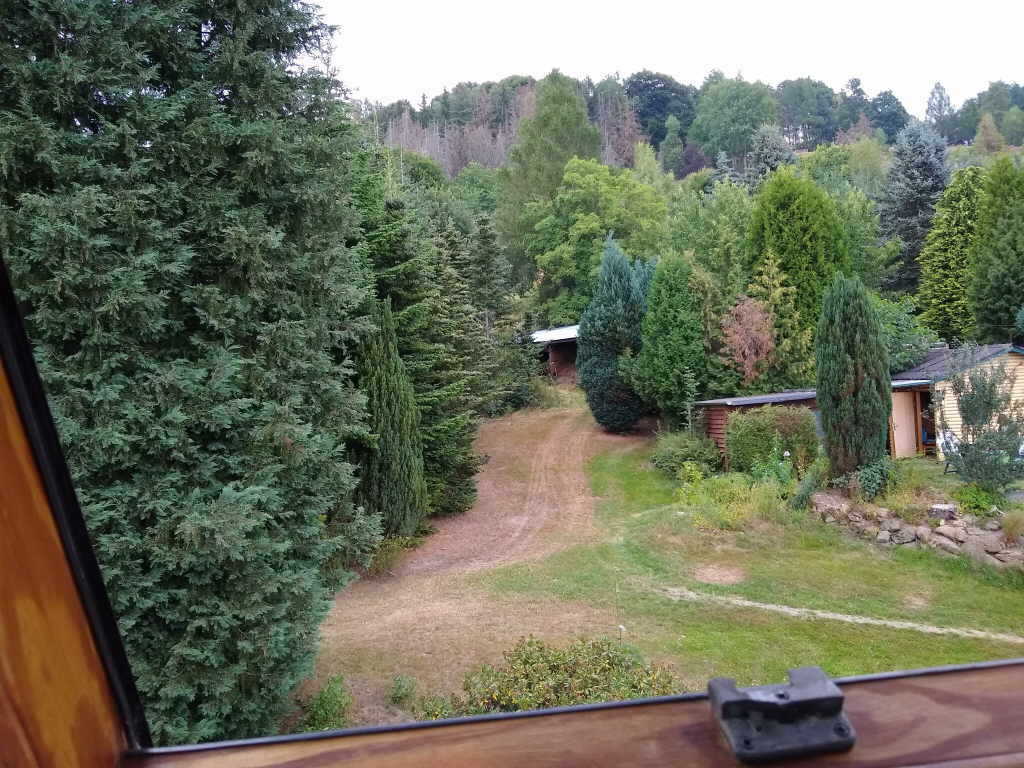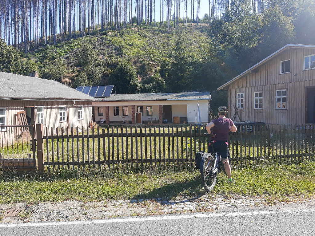 Ehepaar vermietet ist. Also, Kaffee trinken, Sachen packen. Holger fährt mit dem Auto zum Tannenhof, kommt zu Fuß zurück. Wir setzen uns auf die Fahrräder und wieder zurück zum Tannenhof.