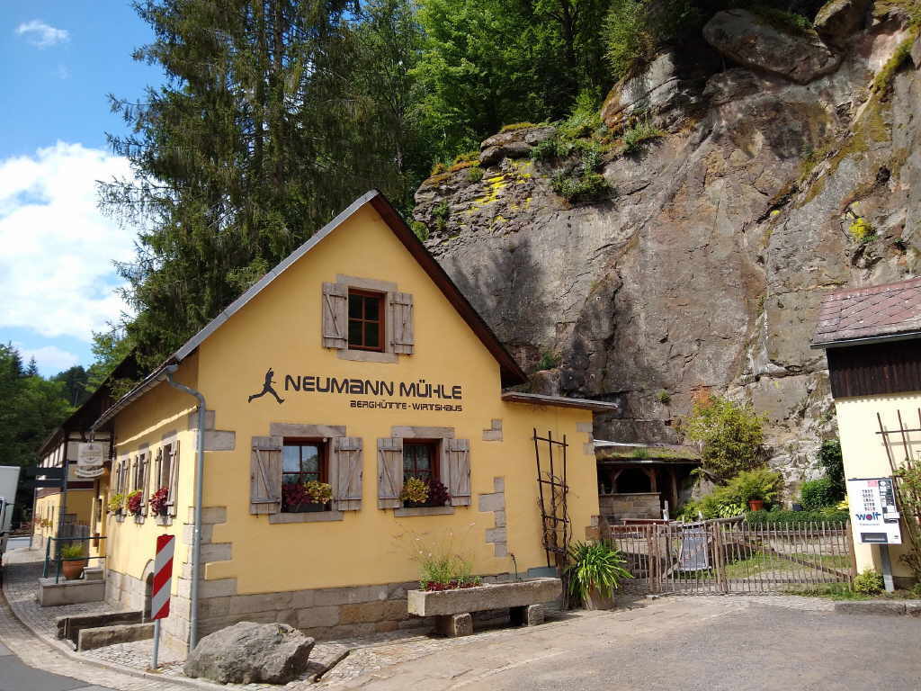 aus Richtung Prebischtor immer noch gut zu sehen.Von Saupsdorf aus fahren wir in Richtung Hinterhermsdorf. Dabei kommen wir an der Gnauckmühle, dem ehemaligen Ferienlager des VEB
