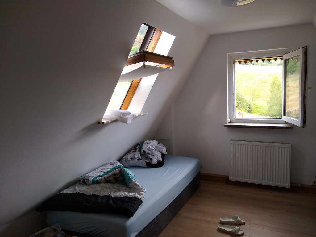 Das Bezihen des Dachzimmers gestaltet sich etwas schwierig. Der letzte Absatz vor dem Zimmer ist nur über eine ganz schön steile Stiege zu erreichen. Das Zimmer ist recht klein und das