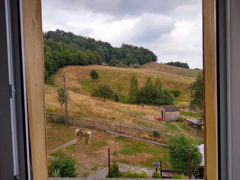 Um 07:00 Uhr ist die Nacht vorbei. Die Nacht im Mansardenzimmer war ziemlich warm. Es scheint auch nicht wirklich geregnet zu haben. Zum Frühstück unterhalten wir uns mit dem Wirtsleuten