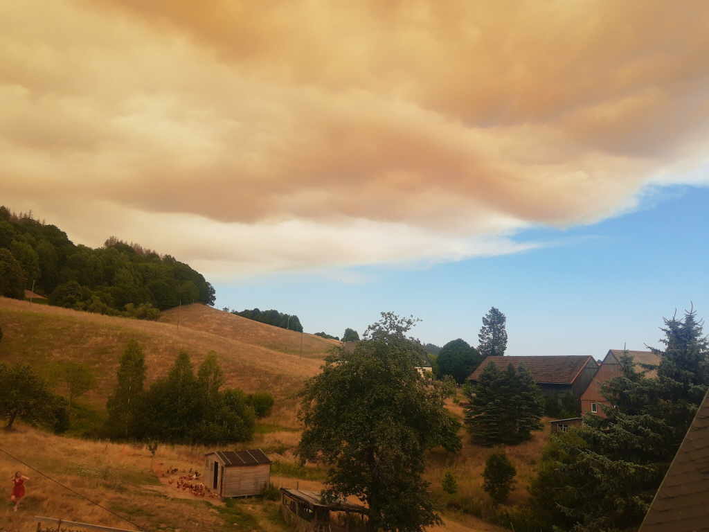 Wir werfen einen Blick aus dem Fenster und erschrecken. Die Rauchwolken ziehen jetzt schon in unsere Richtung und gegen 16:00 fallen auch die ersten Rußflocken vom Himmell. Ines überlegt